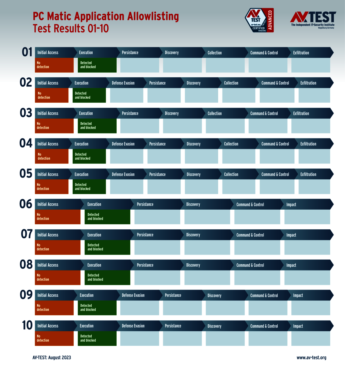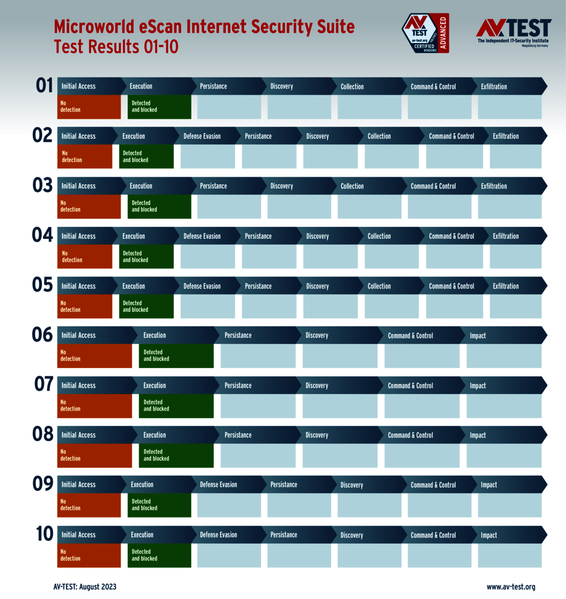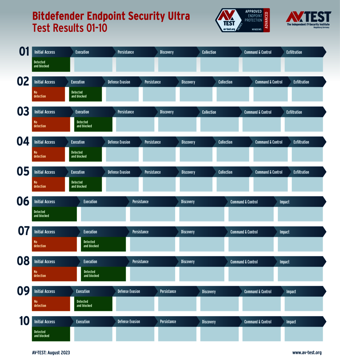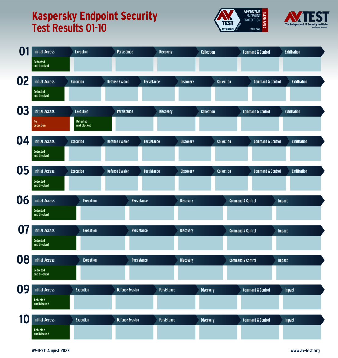 In the 10 test scenarios, the attackers deployed the latest techniques, such as DNS TXT Record, encrypted connections or even the Rust programming language. But the protection programs know all these variants and respond accordingly in the detection and defense. All in all: nearly exemplary performance!
