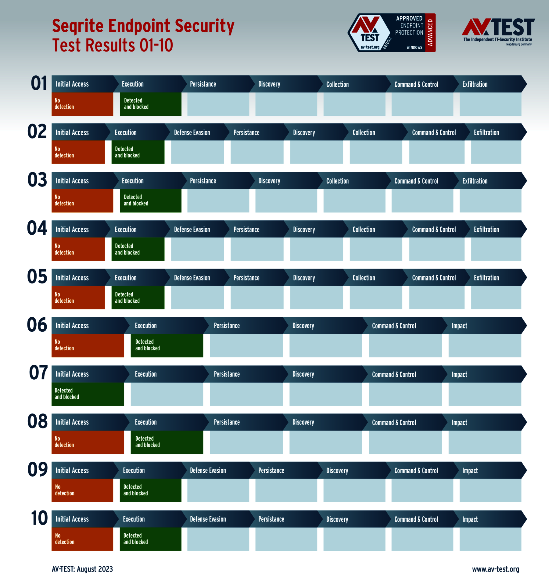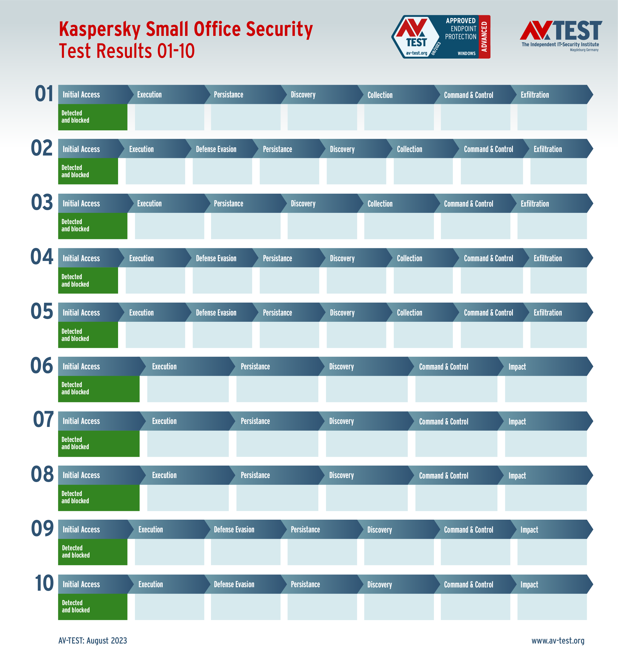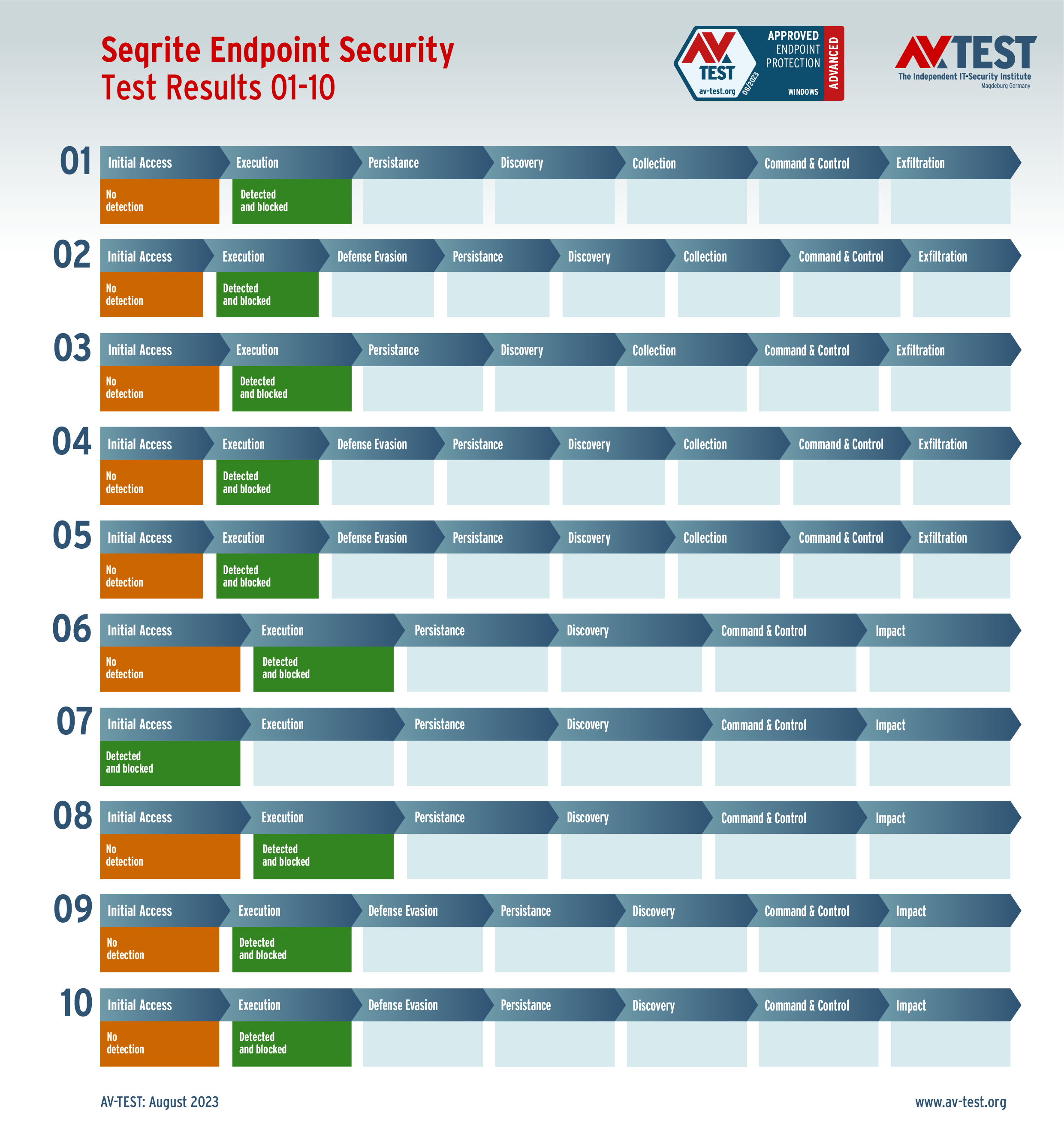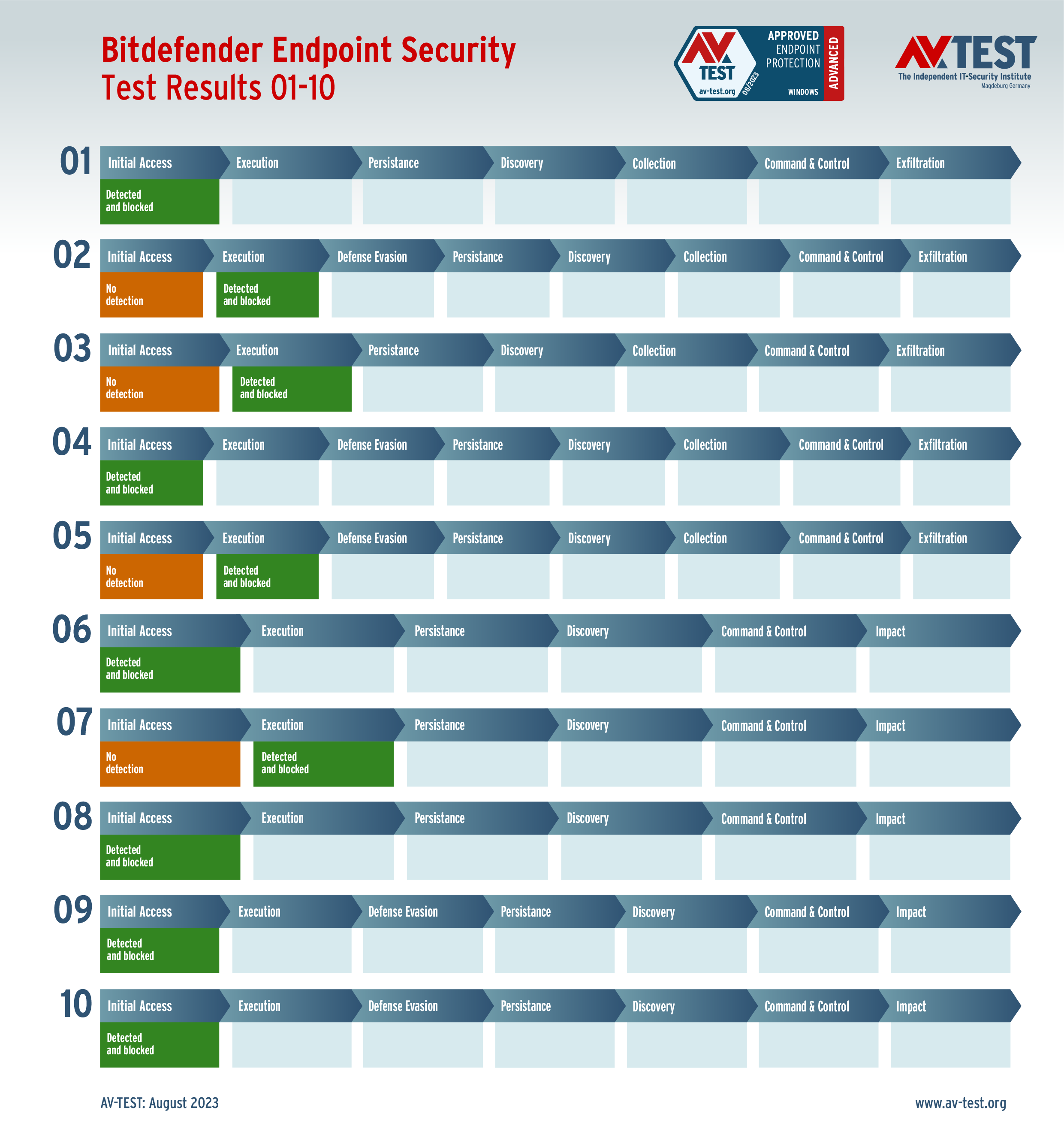 In the 10 test scenarios, the attackers deployed the latest techniques, such as DNS TXT Record, encrypted connections or even the Rust programming language. But the protection programs know all these variants and respond accordingly in the detection and defense. All in all: nearly exemplary performance!