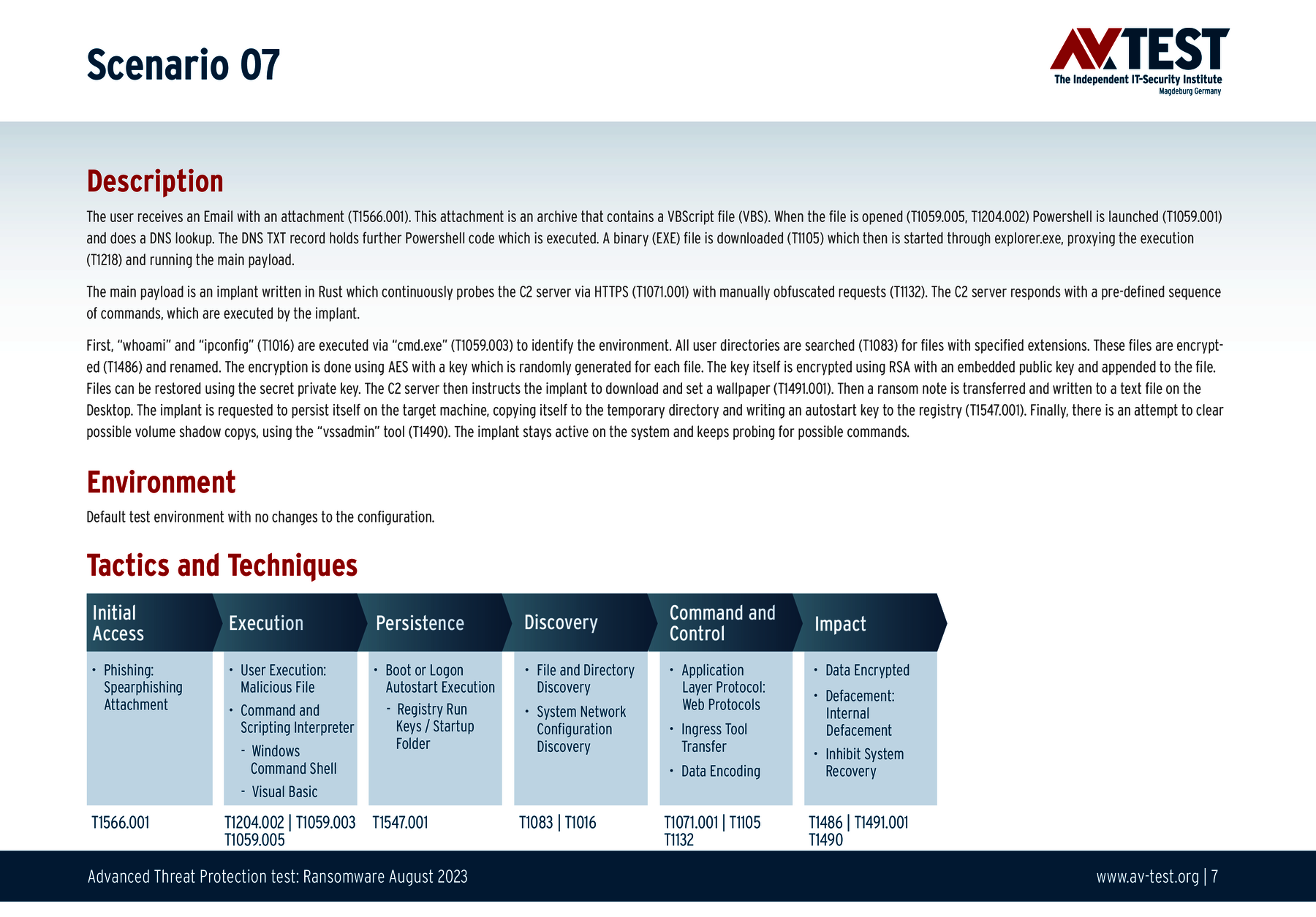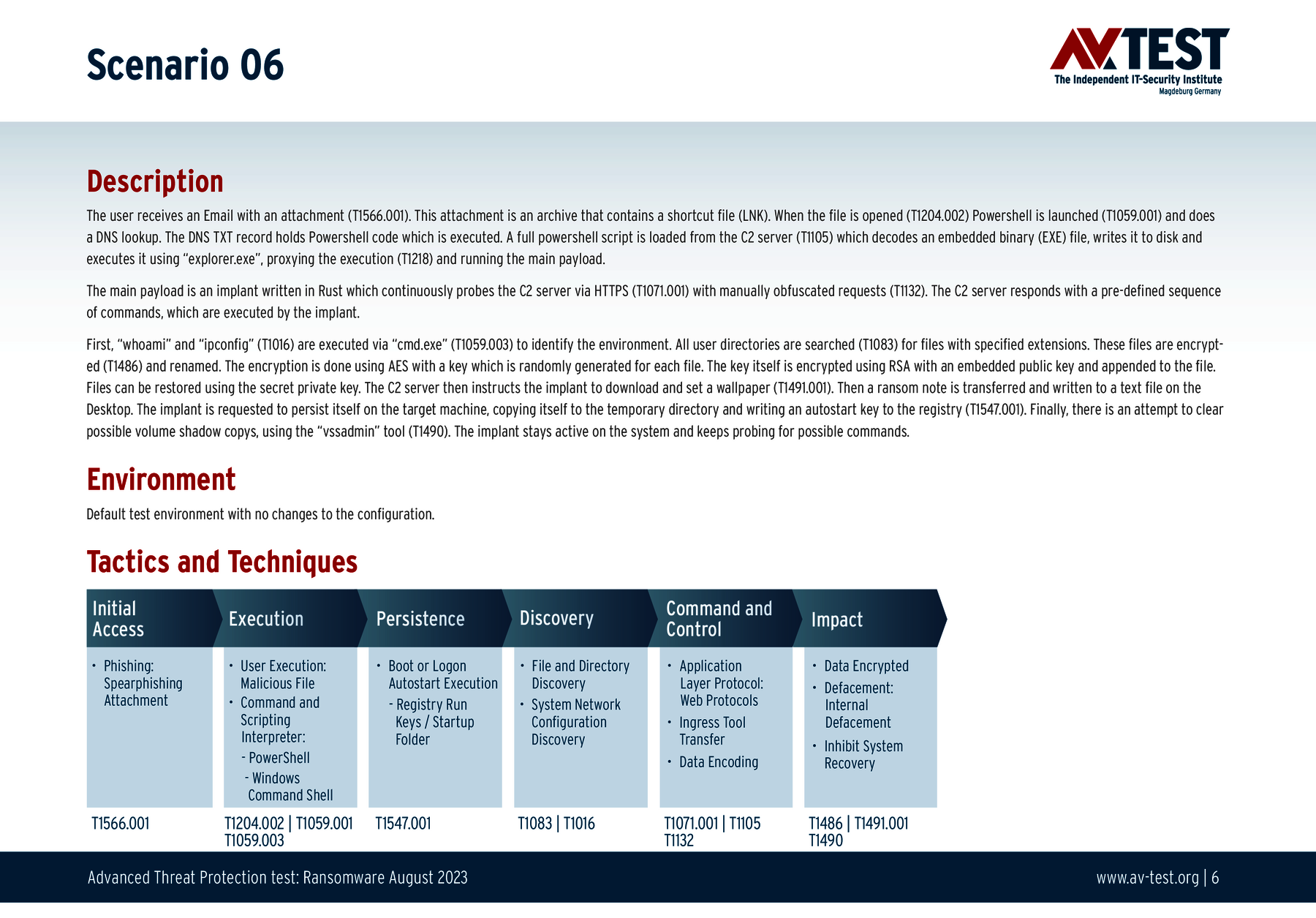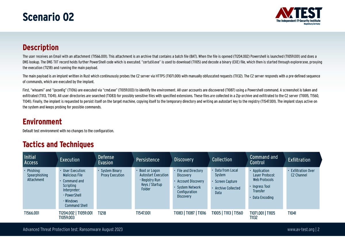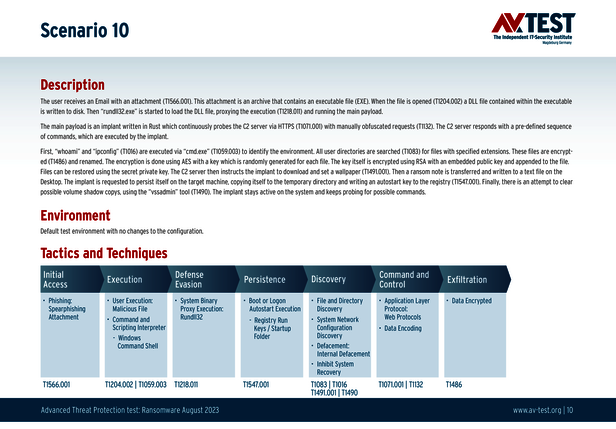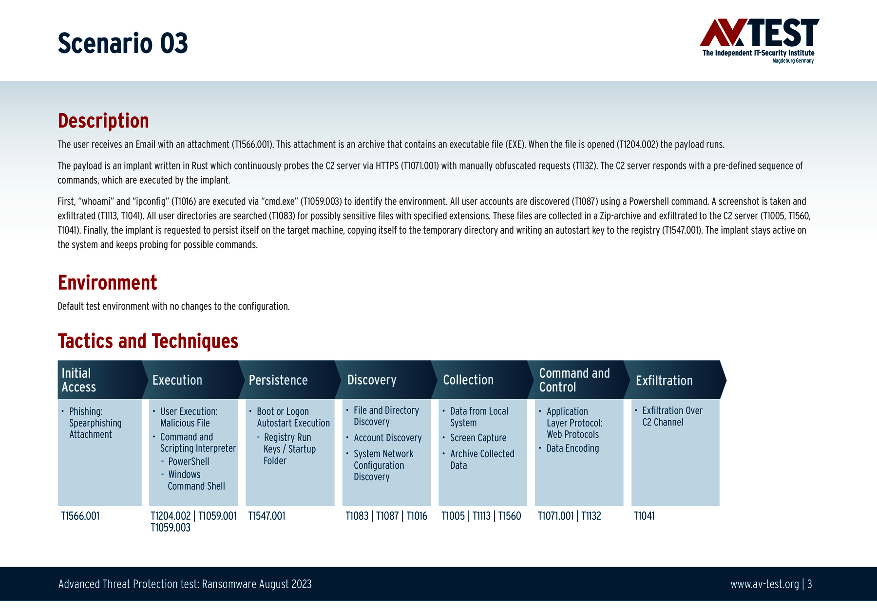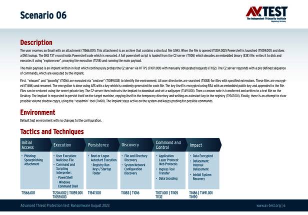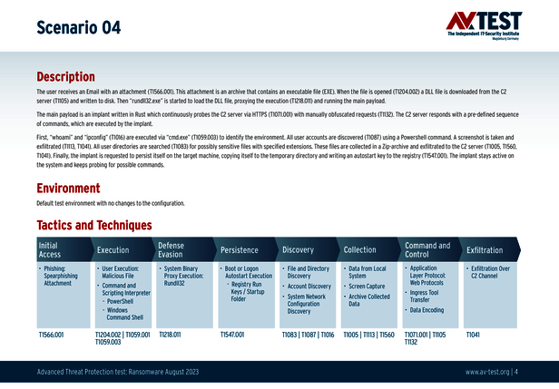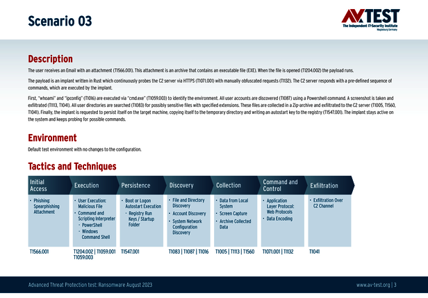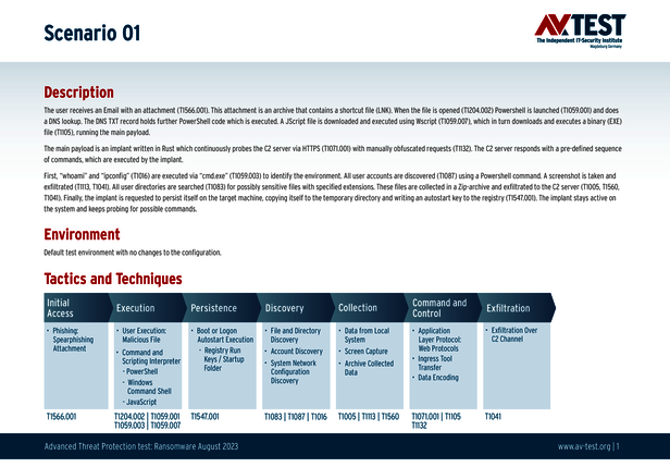 All attack scenarios are documented according to the standard of the MITRE ATT&CK database. The individual sub-techniques, for example "T1566.001", are listed in the MITRE database for "Techniques" under "Phishing: Spearphishing Attachment". Each test step is thus defined among the experts and can be logically understood. In addition, all attack techniques are explained, along with how successful the malware is.