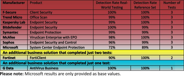 The F-Secure solution was closely followed by the security solutions from Trend Micro and Kaspersky with 99 and 100 percent in the two stages, which were in turn followed by Bitdefender with 100 and 99 percent. The Microsoft security suite was only able to achieve detection rates of 72 and 89 percent in this category and therefore received none of the 6 points available.