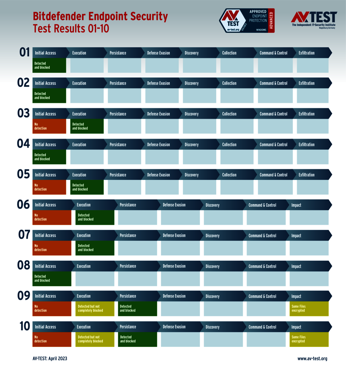 While Bitdefender Endpoint Security detected the attackers in all 10 test scenarios, it was unable to completely stop the attackers in 2 cases involving ransomware. It did execute several countermeasures, but in the end a partial encryption of individual files occurred in both cases. This led to a deduction of points. The result was 33 out of 35 possible points for the protection score.