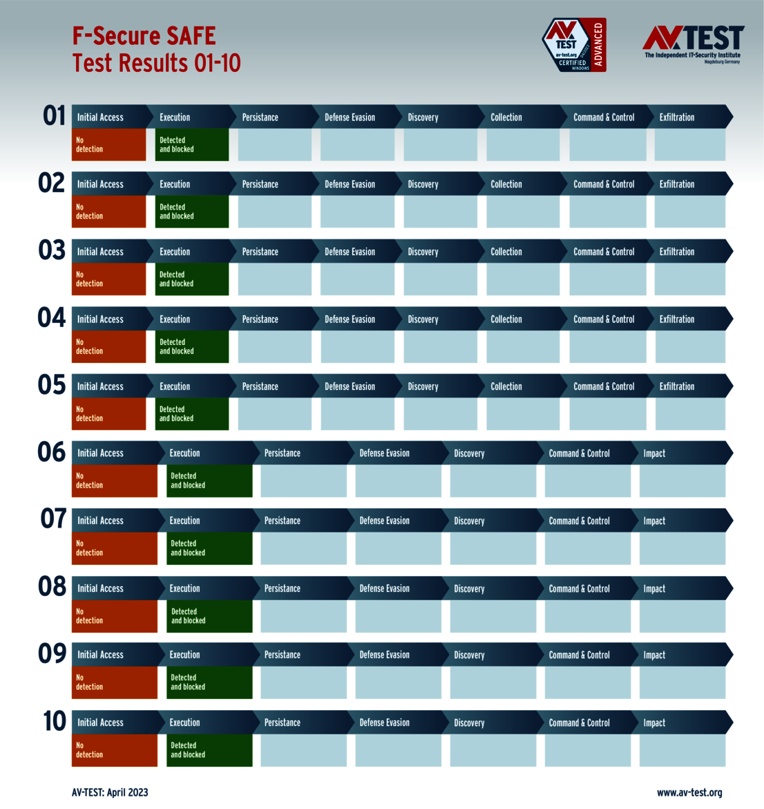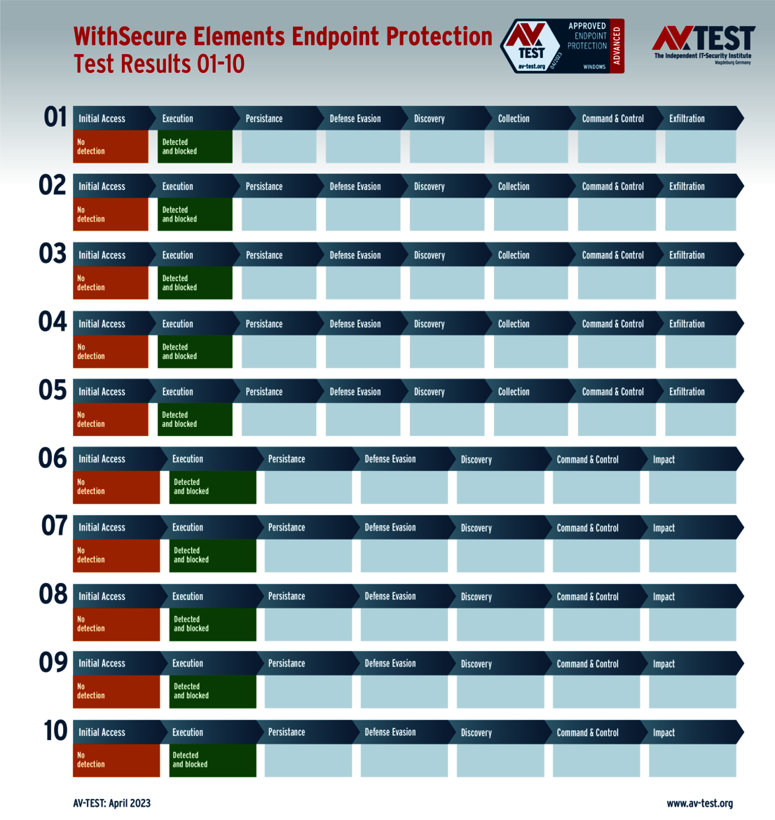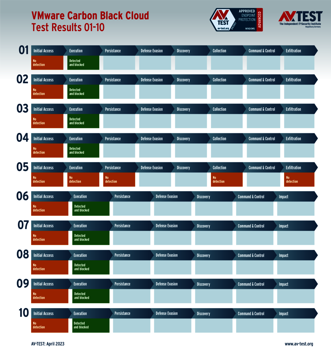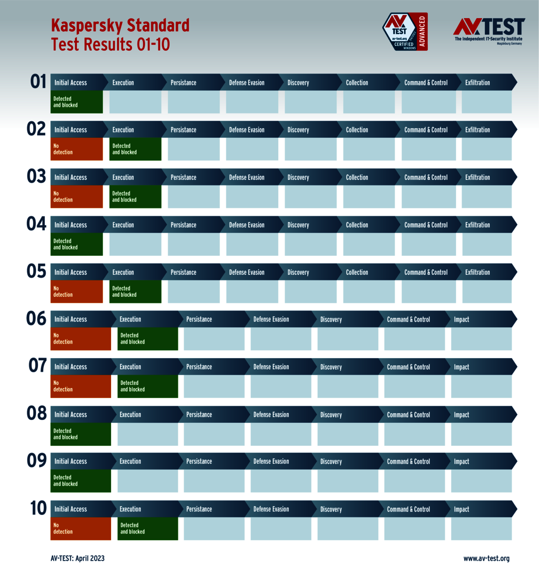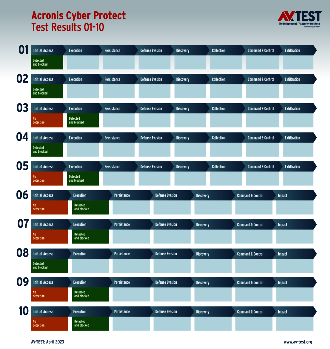 In this test, the lab sent 5 samples of data stealers and 5 samples of ransomware via spearphishing e-mail to the test systems. Afterwards, they first ended up on the system and became active in the next step. Already in these two steps, many products detected the danger and fended off the attack. If that is not the case, the data stealers are able to gather information on the data that they "exfiltrate" to a C2 server. The ransomware also collects information, but with the intention of sending out a file list to the C2 server while the encryption of data is being launched. The 10 scenario graphics show the attack routines. Cases 1 through 5 describe the attack of data stealers and cases 6 through 10 the attacks of ransomware.