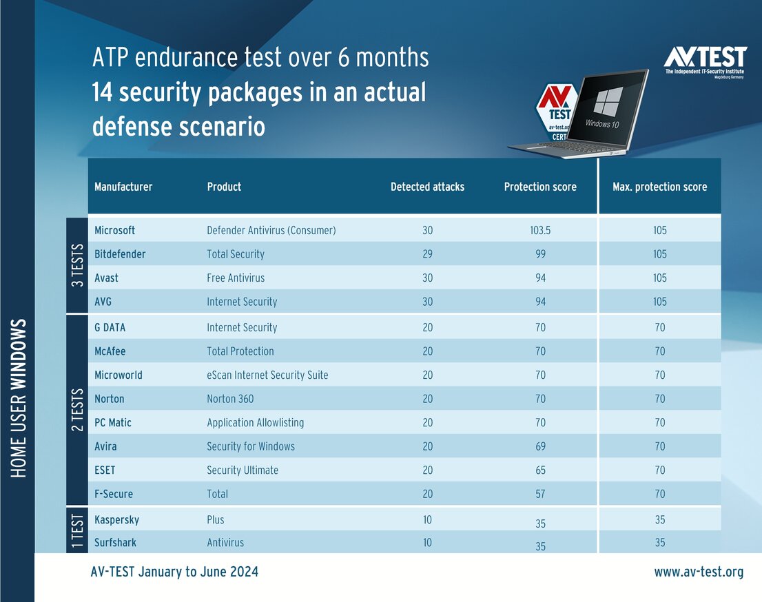 All products have participated in 1, 2 or 3 ATP tests. Each individual test is always carried out within 2 months. In this, some products were examined for a full 6 months from January to June 2024 under Windows 10, other solutions for 4 months, and some in a test for only 2 months. Whereas the products reveal interesting results with one test, the tests over 4 to 6 months provide a good overview of their protection continuity.