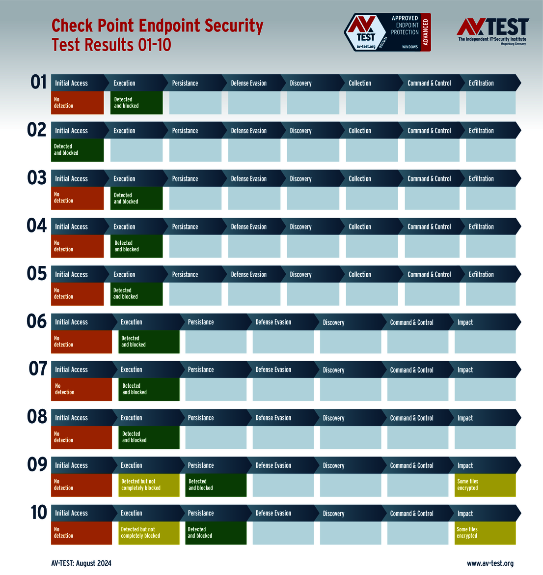 While Check Point's protection solution detected the attackers in all 10 scenarios, in 2 cases with ransomware, the product was not able to completely prevent the attack. In further defensive steps, the solution then held up large-scale encryption, but individual files were ultimately encrypted. This cost the product a total of 2 points in the evaluation, and it ended up with 33 out of 35 points.