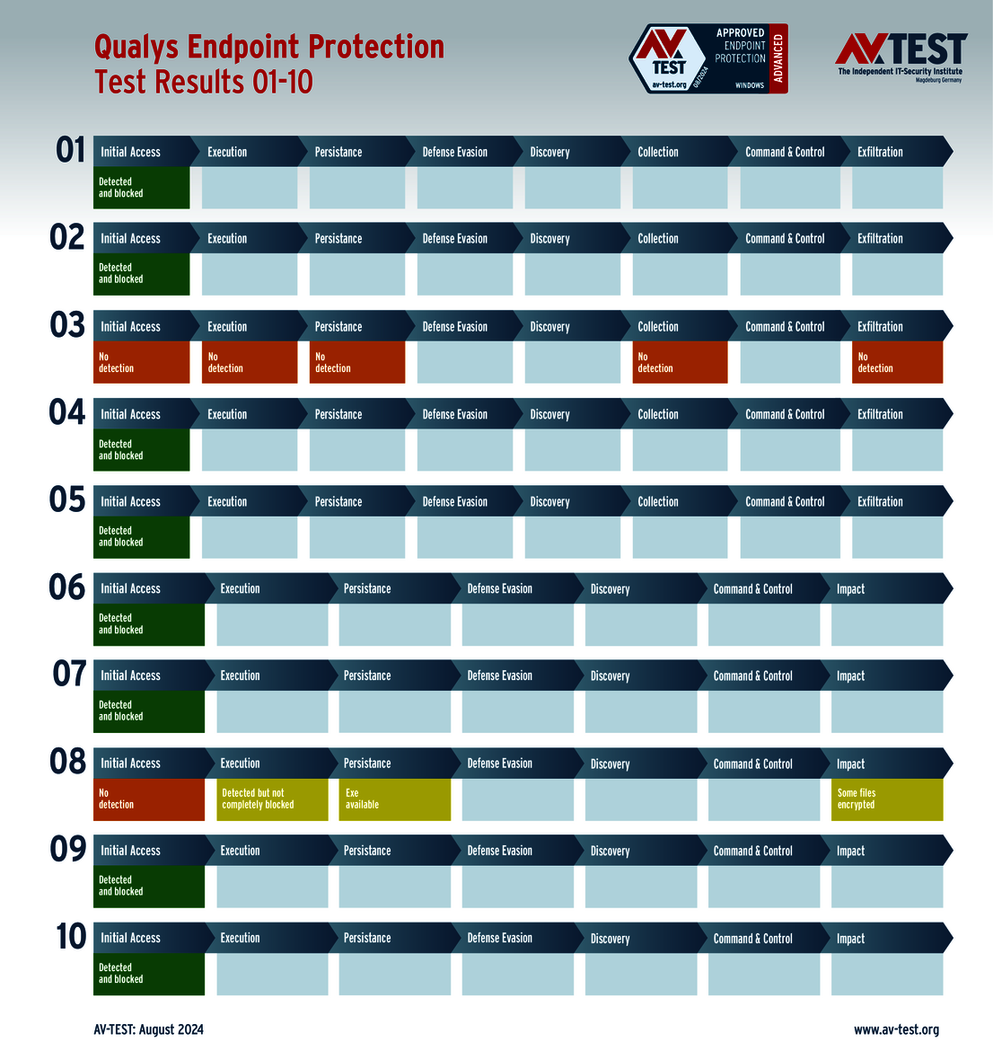 The Qualys solution for the endpoint identified only 9 out of 10 attacks, allowing an info stealer to steal all the data, causing the product to lose all 4 points in this case. Added to this was another ransomware attack that was detected but not completely stopped. In the end, individual files were encrypted and an additional 1.5 points were lost. The Qualys protection score was therefore still 29.5 out of 35 points.