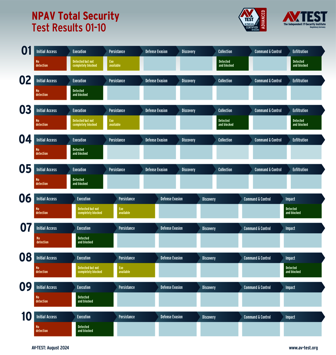 While the product from NPAV detected the attackers in all 10 scenarios, in 4 cases – two with ransomware and two with info stealers – it was initially unable to stop attack. Only through the use of additional protection modules was it possible to thwart the attack. However, the executable files of the attacker remained on the system in the aftermath of the attack. For these errors, the lab deducted half a point a total of 8 times, leaving NPAV with only 31 out of 35 possible points when it comes to the protection score.