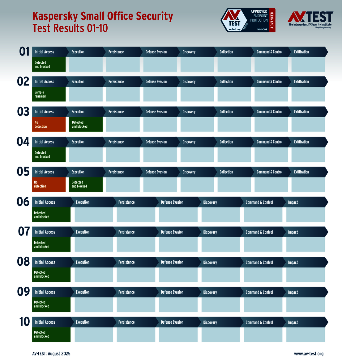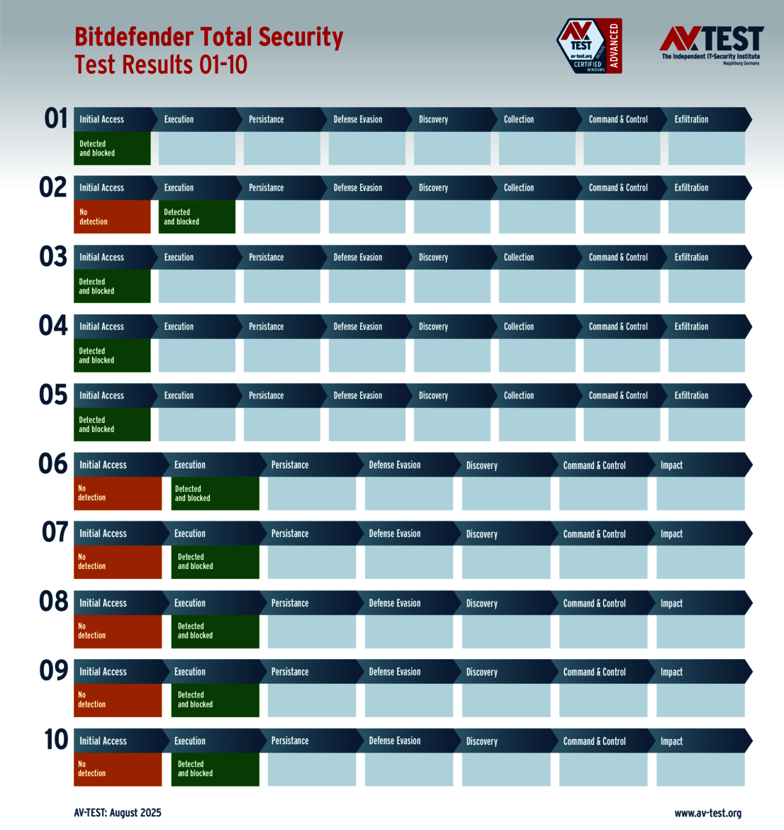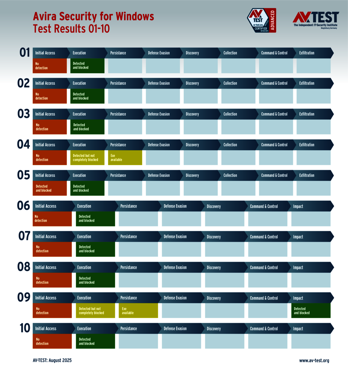 The techniques used for the attacks by these groups of malware are sophisticated, but they are not insurmountable. This is also evidenced by the vast AV-ATLAS database from AV-TEST, which has already detected and registered nearly one billion samples of malware for Windows systems. Nonetheless, attackers are always uncovering new vulnerabilities, using devious attack variants, or combining both to exploit unwitting systems. Which means that good security software also needs to identify these new techniques and provide protection to the systems. Sometimes, it’s not enough to just identify the malware. Some attackers use obfuscation to conceal themselves in seemingly harmless processes, enabling them to evade detection in a scan for malware. Does that mean it’s time to throw in the towel? This was precisely the question resolved by the Advanced Threat Protection (ATP) test. The testers followed 10 attacks with ransomware and infostealers step by step in this live test of systems running Windows 10. The malware in the testing employed the latest in attack technology to evade detection. And when they attempt this feat, the downstream defense mechanisms need to intervene and stop the attack. The ATP test clearly shows how well the different solutions performed in the various stages.