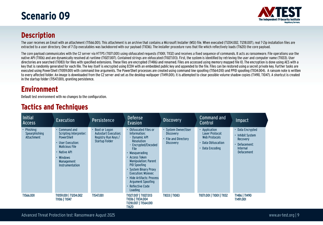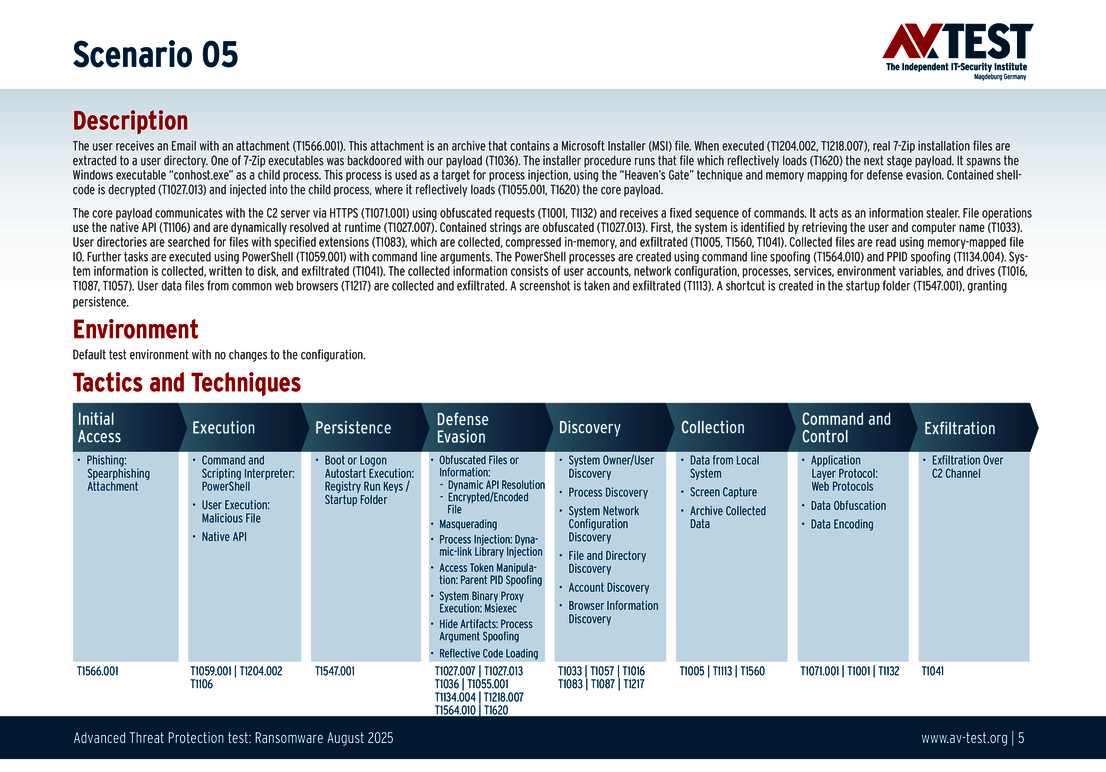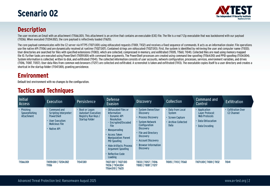 All attack scenarios are documented according to the standard of the MITRE ATT&CK database. The individual sub-techniques are listed in the MITRE database for "Techniques", for example "T1566.001" under "Phishing: Spearphishing Attachment”. Each test step is thus defined among the experts and can be logically understood. In addition, all attack techniques are explained, along with how the malware infection occurs and impacts systems.