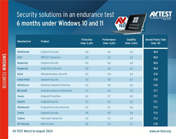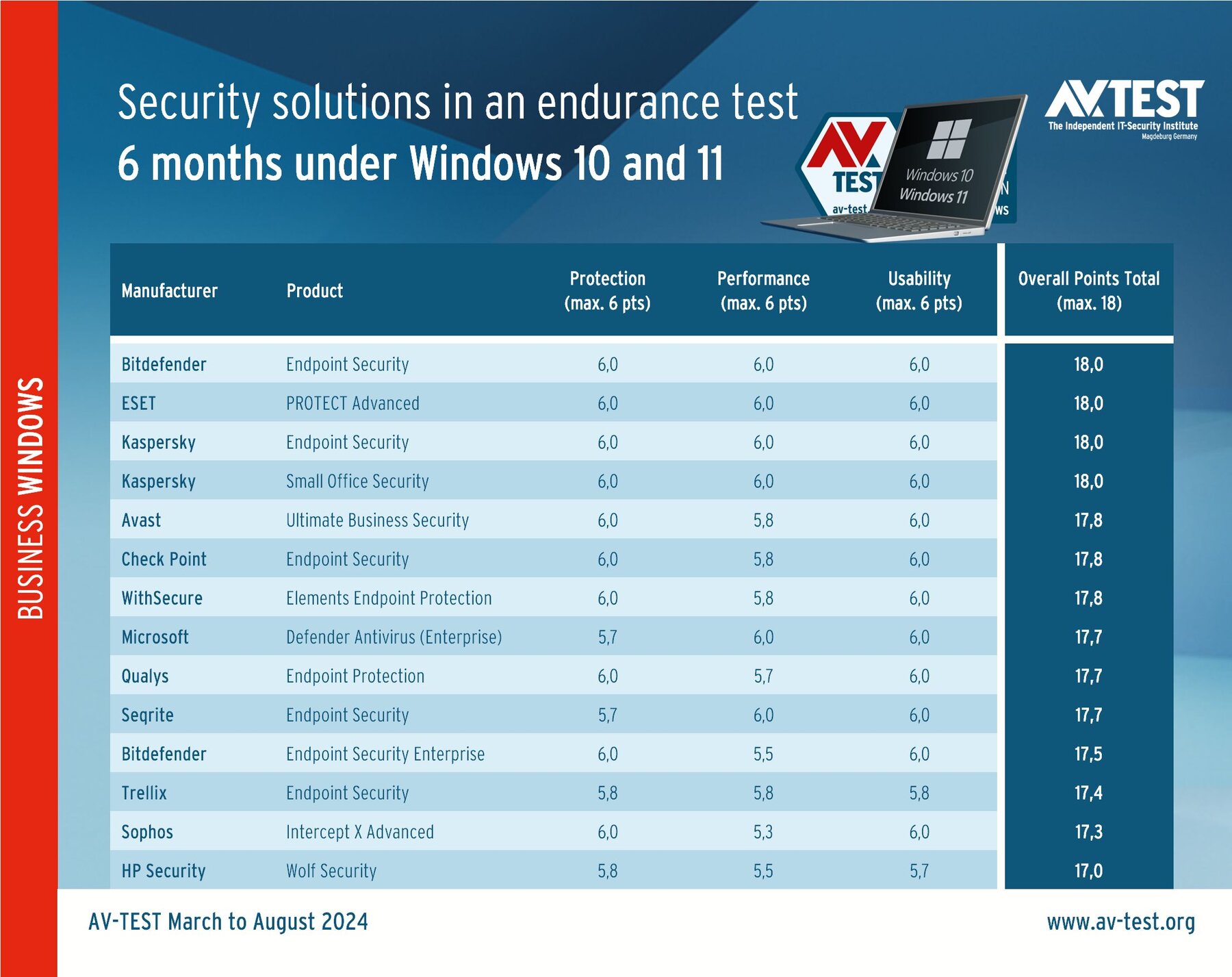 The number of cyberattacks with malware has reached peak levels. The attacks often threaten not only the data of a company but also its existence. That is why a perfectly functioning security solution for corporate users is more important than ever. But which product shows the best performance in an endurance test on the front line, fending off the 24/7 wave of malware? The endurance test of security solutions for corporate users provides answers to this question. The latest endurance test examined 14 company solutions in the lab of AV-TEST for 6 months from March to August 2024 under Windows 10 and 11.
