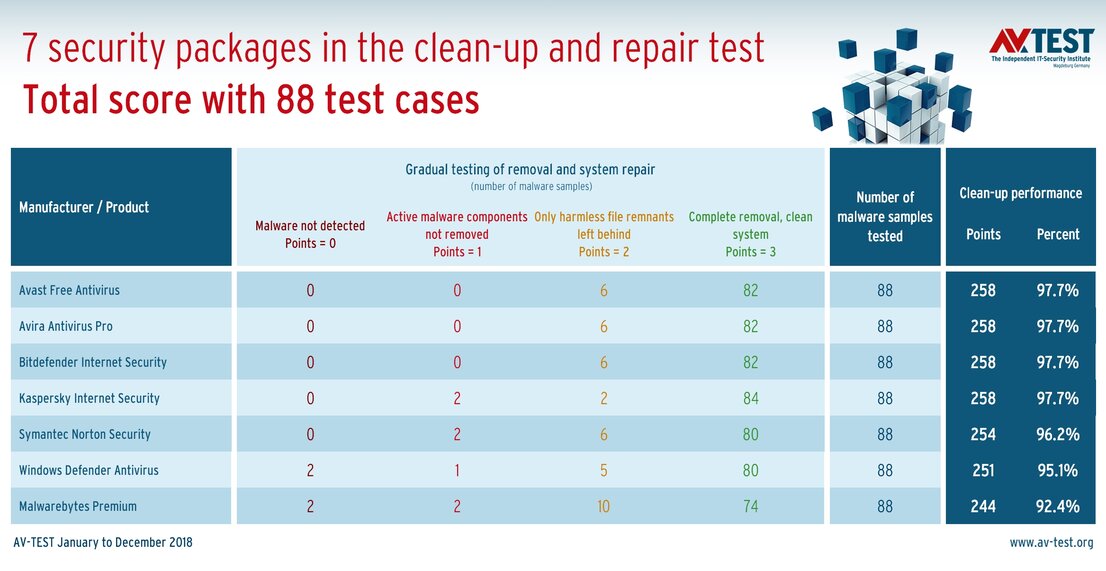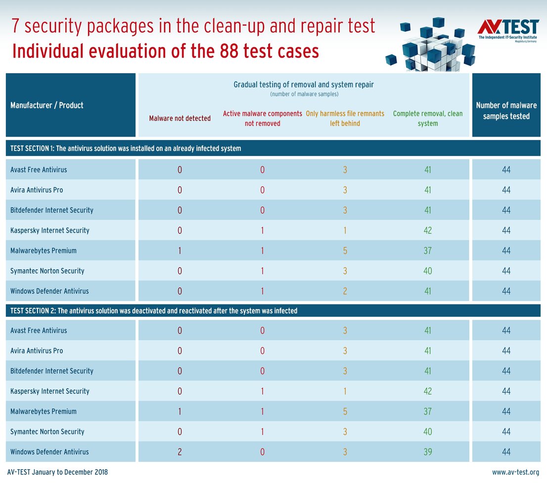 In the 7 security suites tested, there are 3 first place rankings with clean-up performance of 97.7 percent each in 88 test cases: Avast Free Antivirus, Avira Antivirus Pro and Bitdefender Internet Security. They each rendered 82 systems absolutely clean and left only harmless file remnants in 6 cases. That's almost perfect performance.