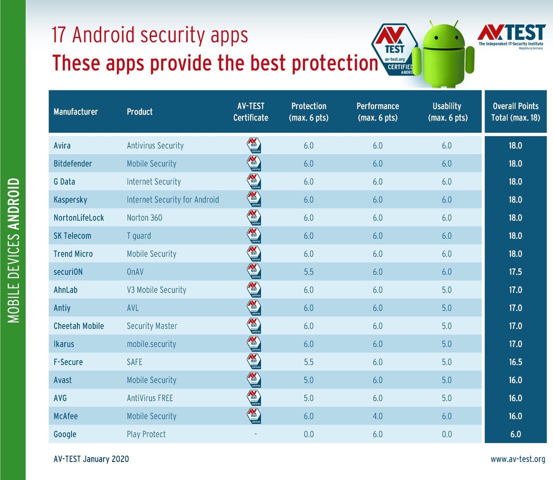 In all test categories, the lab evaluates the apps, awarding up to 6 points in the three categories. In this test, the best result of 18 points was achieved by the security apps from Avira, Bitdefender, G Data, Kaspersky, NortonLifeLock, SK Telecom and Trend Micro. Following very close behind is the app from securiON at 17.5 points. An additional 8 apps achieved 17 and 16 points respectively in the test. Last place finisher is Google Play Protect with a total of only 6 points. That is far too little for the AV-TEST certificate. All the other apps examined earn enough points for the certificate, documenting the proven security.