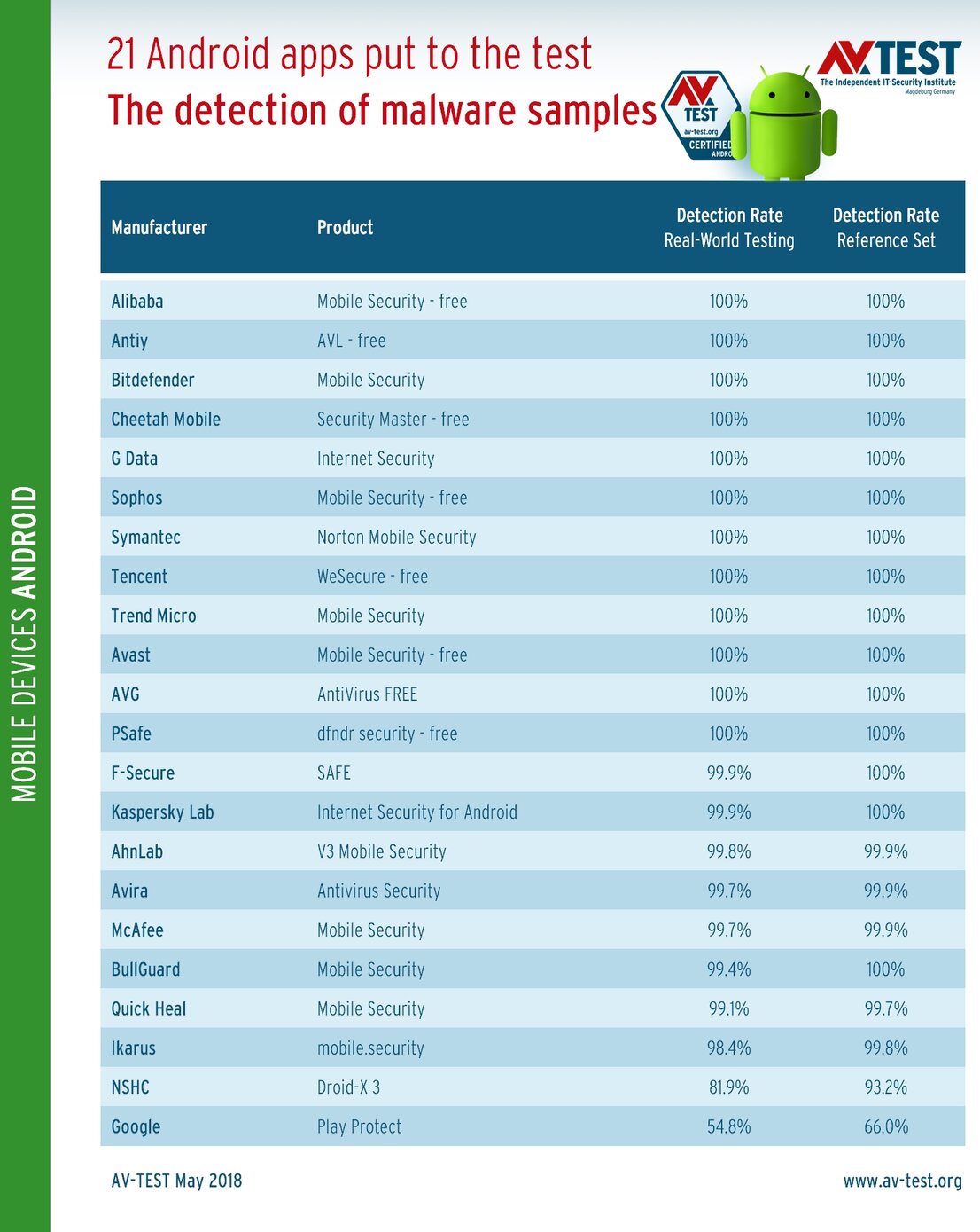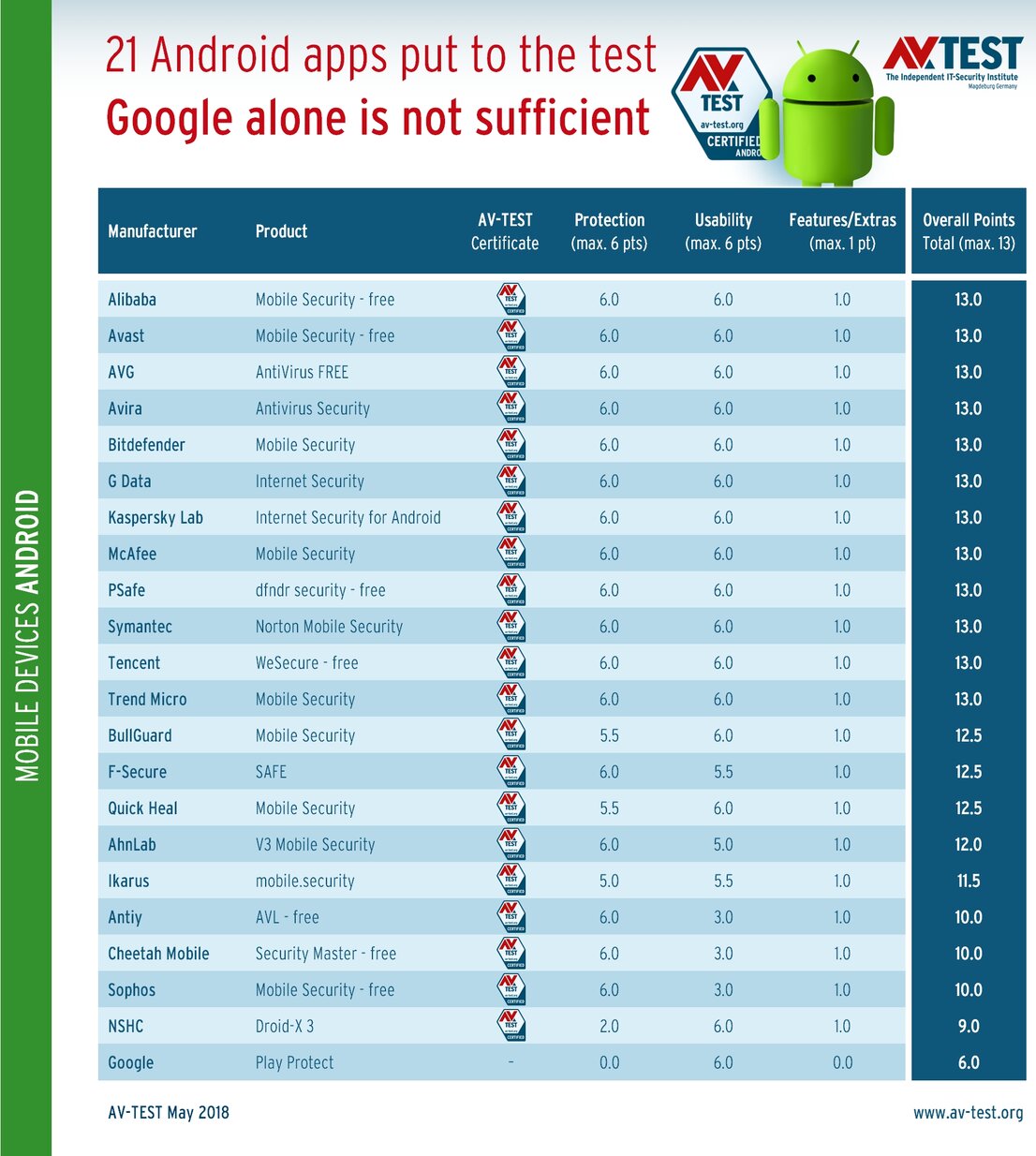 In May 2018, the lab examined a total of 21 security apps and Google Play Protect under the Android 6.0.1 platform. In the two test segments of protection and usability, the laboratory awards a maximum of 6 points, and a maximum of 1 point for features. A total of 12 apps achieved the top score of 13 points: Alibaba, Avast, AVG, Avira, Bitdefender, G Data, Kaspersky Lab, McAfee, PSafe, Symantec, Tencent and Trend Micro. An additional 3 apps still received an excellent point score of 12.5: BullGuard, F-Secure and Quick Heal. The remaining apps achieved between 12 and 9 points. At the end of the list is Google Play Protect, also tested, with only 6 points.