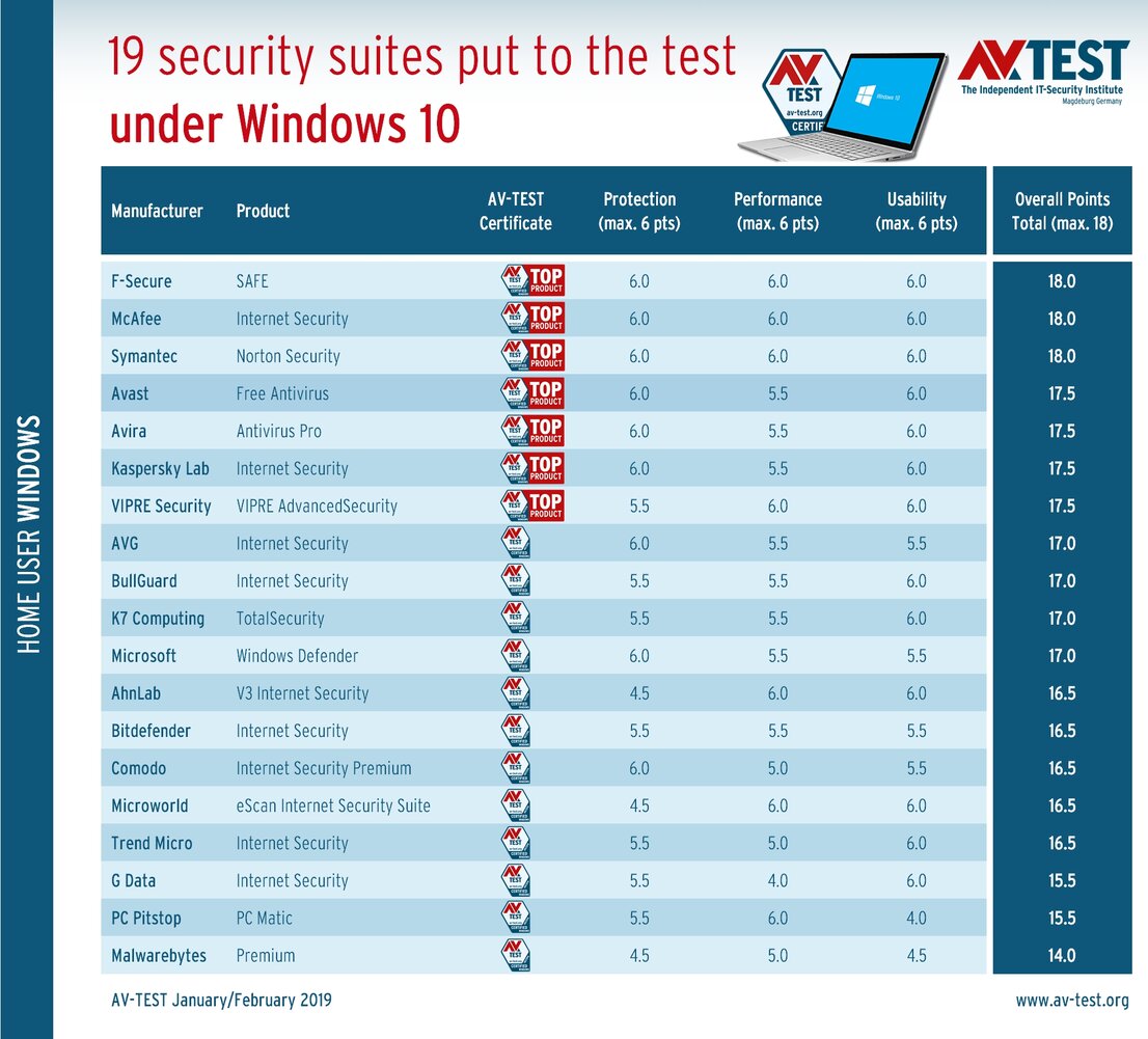The final result of the tests indicates strong performance in most security packages. F-Secure, McAfee and Symantec delivered a perfect score of 18 points, followed by Avast, Avira, Kaspersky Lab and VIPRE Security with 17.5 points. That is why all these packages received additional TOP PRODUCT recognition.