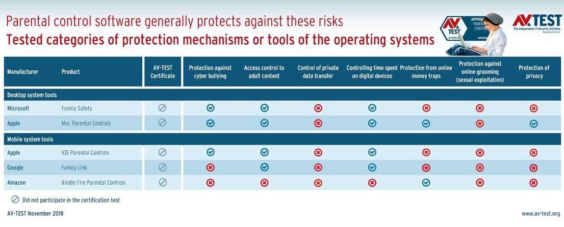 The test evaluated the following: Windows 10, MacOS High Sierra, Android 8.0, iOS 12 and Fire OS from Amazon; that is an adapted Android system. Each system has internal functions, and the desktop systems have add-on software. The exact product names were: Microsoft Family Safety, Mac Parental Controls, Google Family Link, iOS Parental Controls and Kindle Fire Parental Controls.