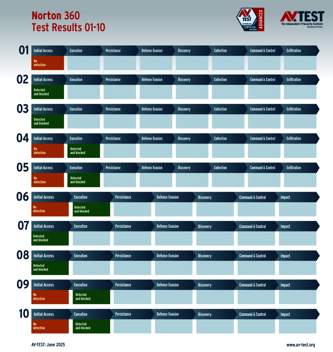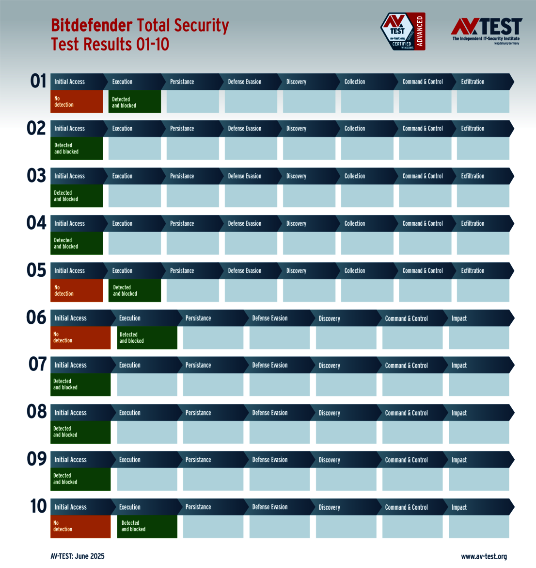 All attack scenarios are documented according to the standard of the MITRE ATT&CK database. The individual sub-techniques are listed in the MITRE database for "Techniques", for example "T1566.001" under "Phishing: Spearphishing Attachment". Each test step is thus defined among the experts and can be logically understood. In addition, all attack techniques are explained, along with how successful the malware is.