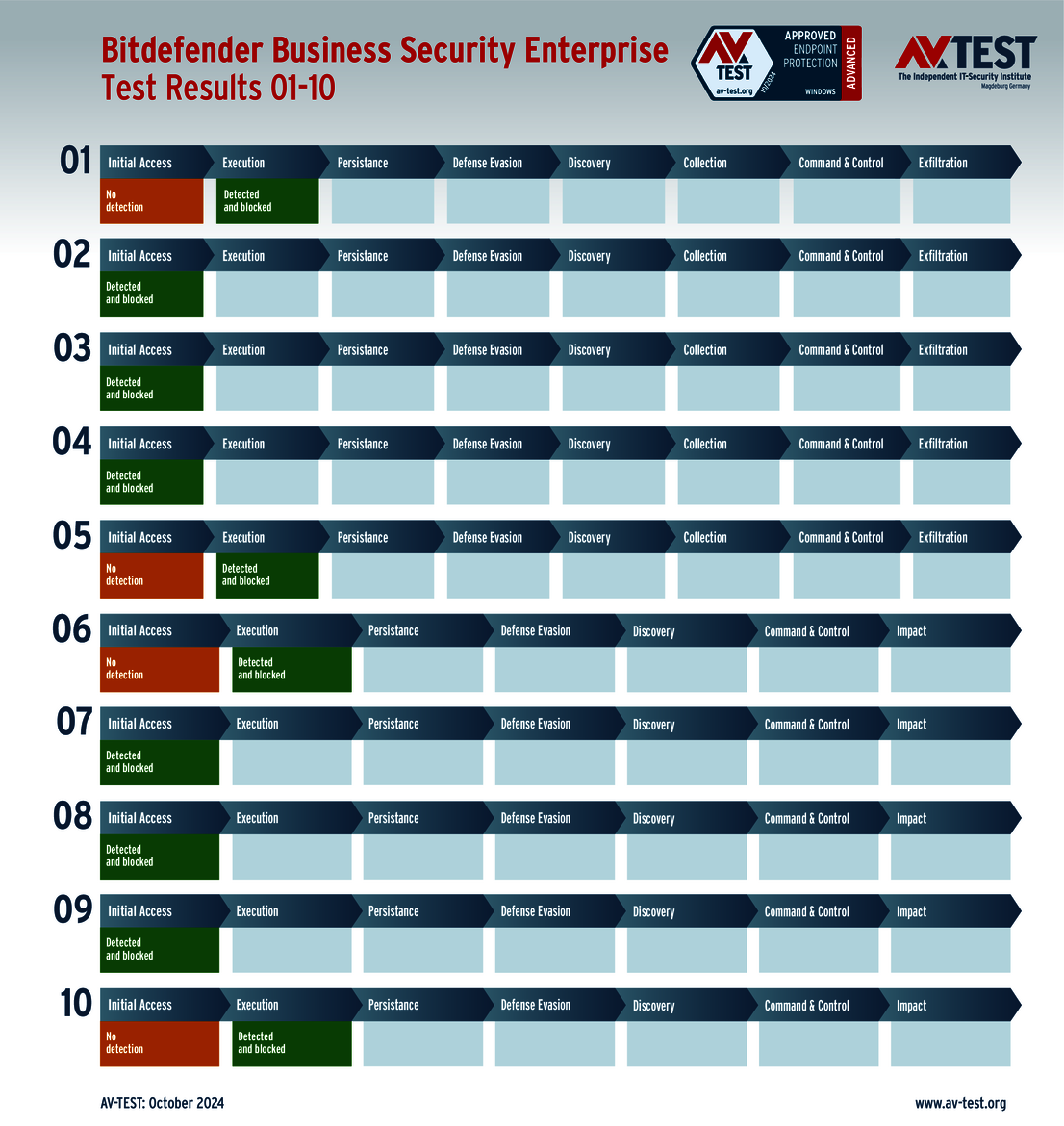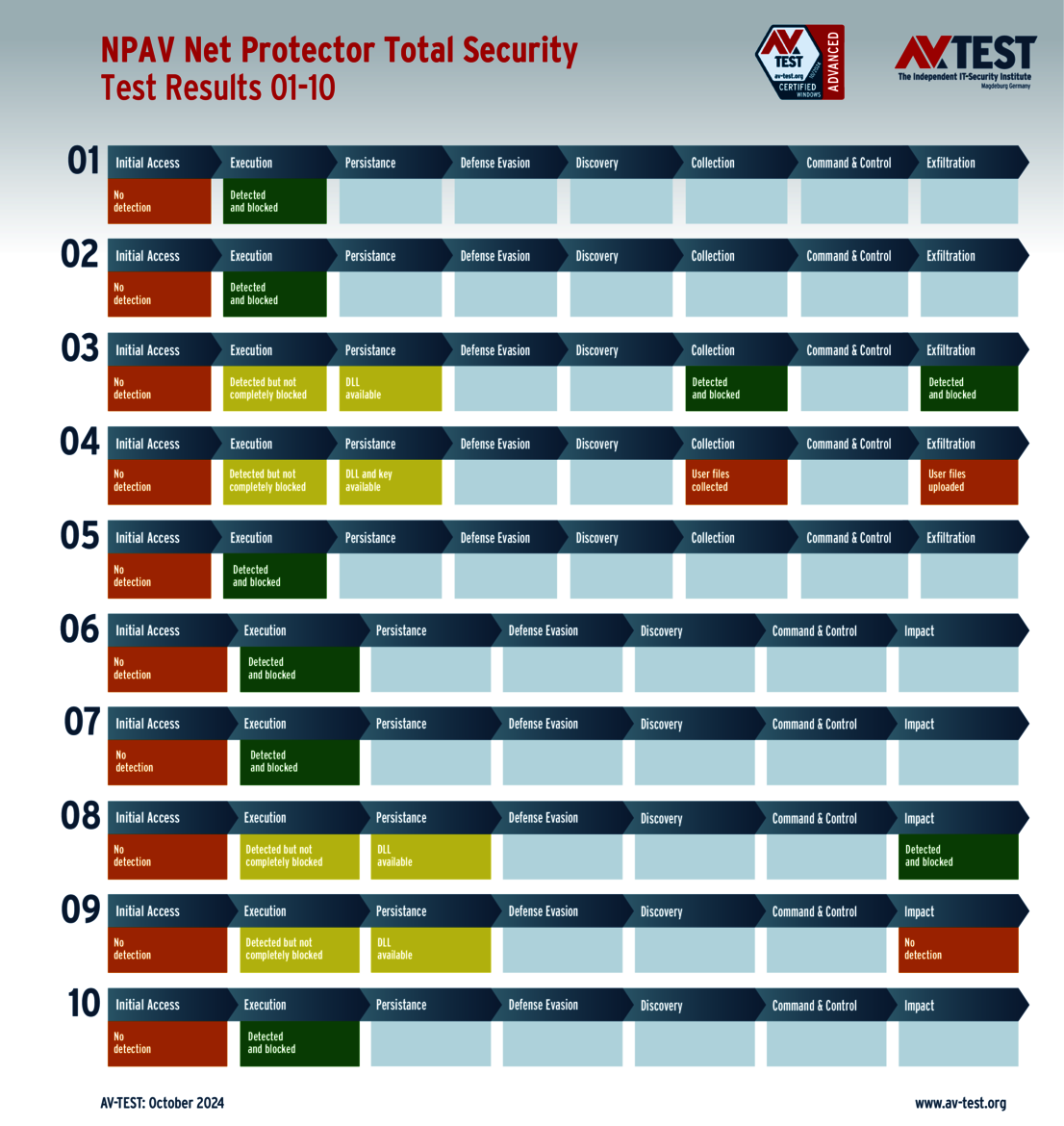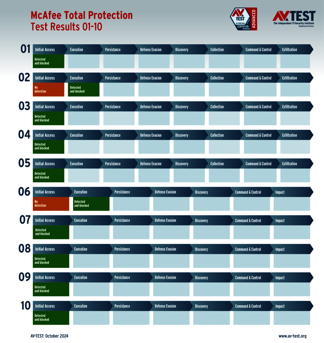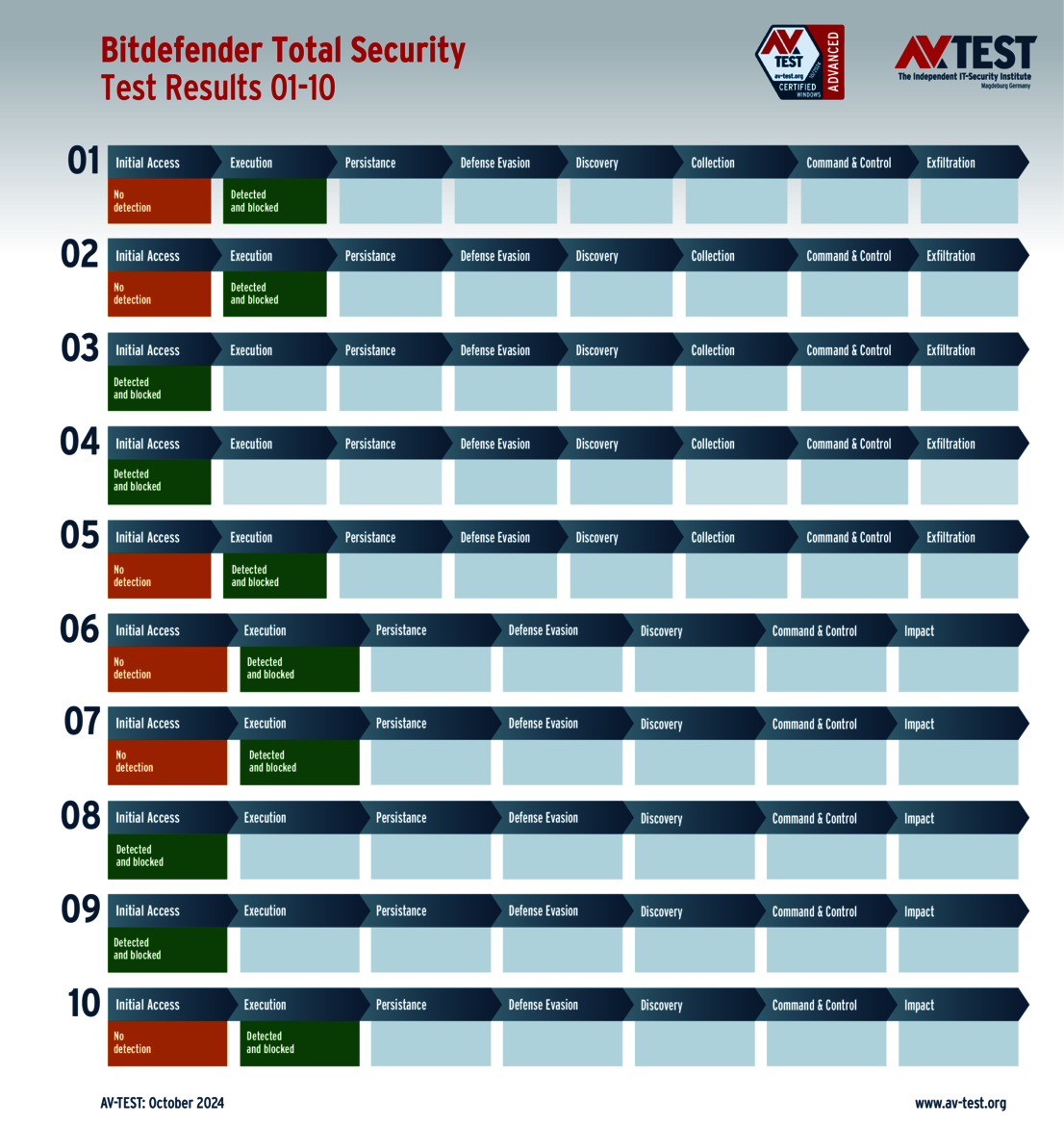 All attack scenarios are documented according to the standard of the MITRE ATT&CK database. The individual sub-techniques are listed in the MITRE database for “Techniques”, for example “T1566.001” under “Phishing: Spearphishing Attachment“. Each test step is thus defined among the experts and can be logically understood. In addition, all attack techniques are explained, along with how successful the malware is.
