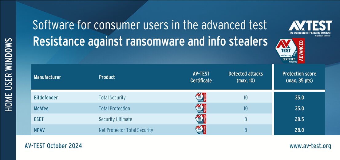 A total of 12 products faced off in the Advanced Threat Protection test: Antivirus programs for consumer users included the packages from Bitdefender, ESET, McAfee and NPAV. Solutions for corporate users involved a line-up of products from the following manufacturers: Bitdefender (with 2 versions), ESET, Kaspersky (with 2 versions), Microworld, Qualys and Trellix. All the data was collected and evaluated in September and October 2024 under Windows 11.