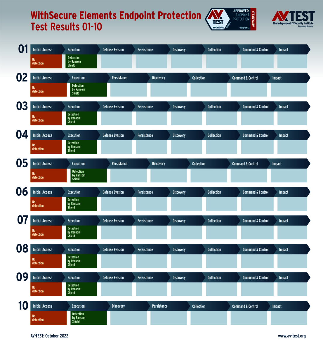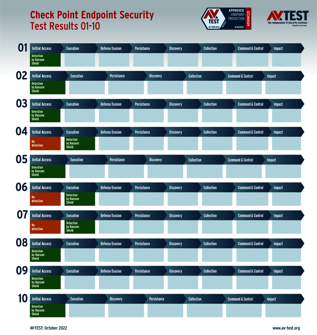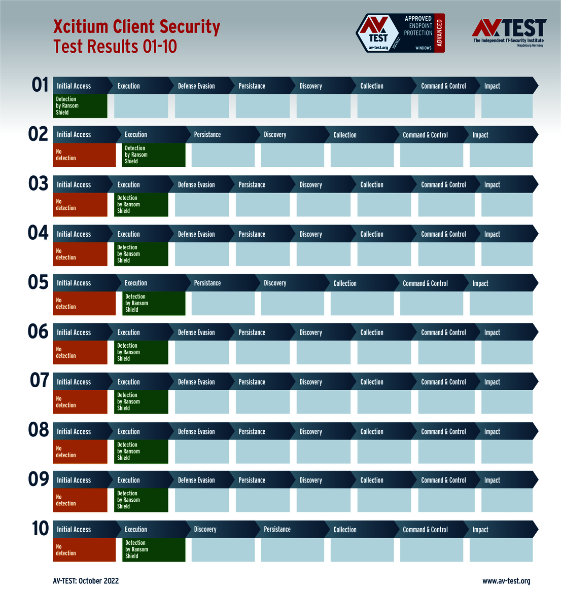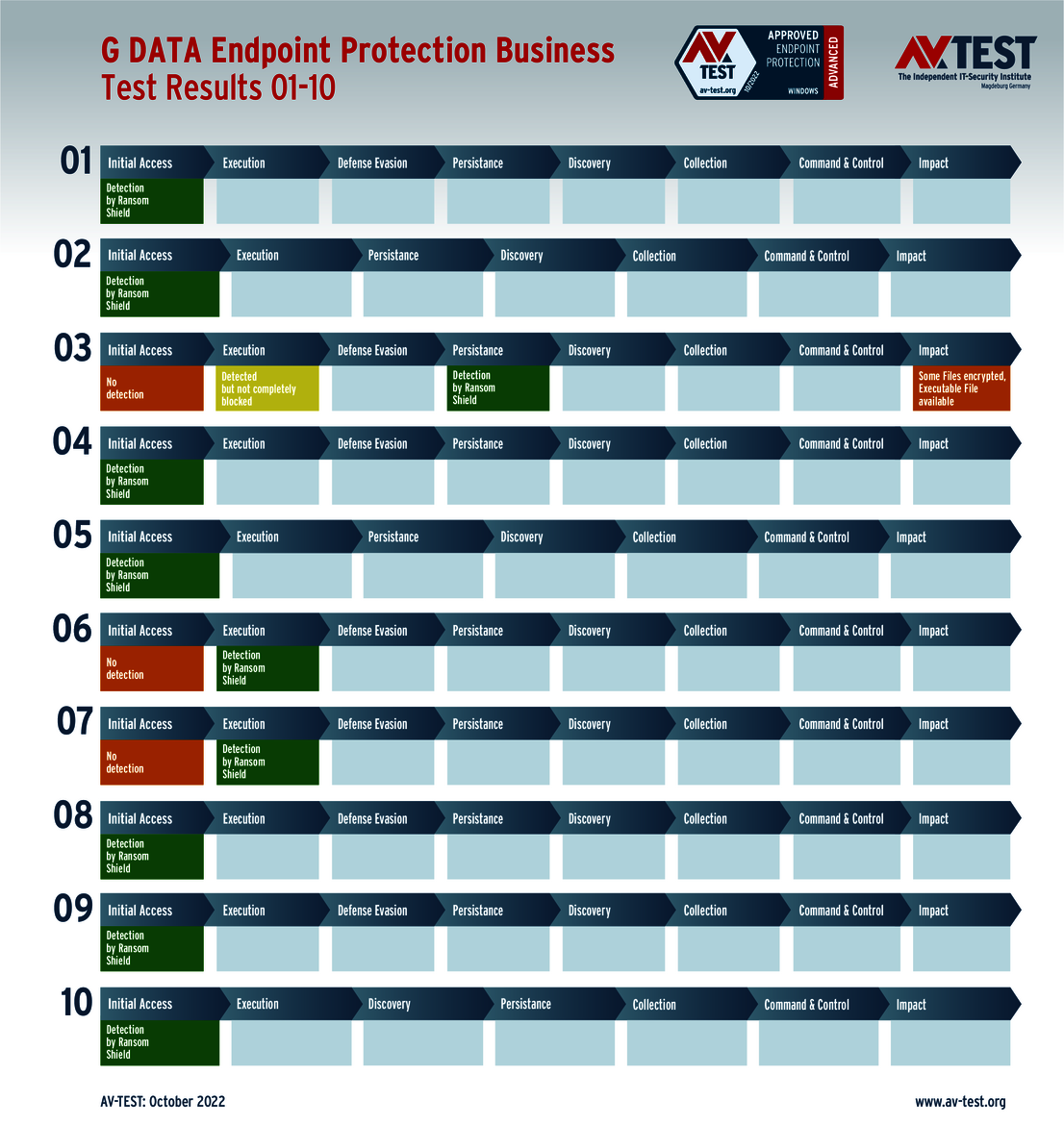 The Advanced Threat Protection test series is a challenge for any product being evaluated, as it typically encounters difficult and dynamic attack scenarios, as is the case in everyday use. The routines used in this test are described by the scenarios 1 to 10 illustrated in the tabs below. In order to enable professionals to interpret the test more effectively, the lab used for its description the internationally defined “Techniques" codes from MITRE ATT&CK.