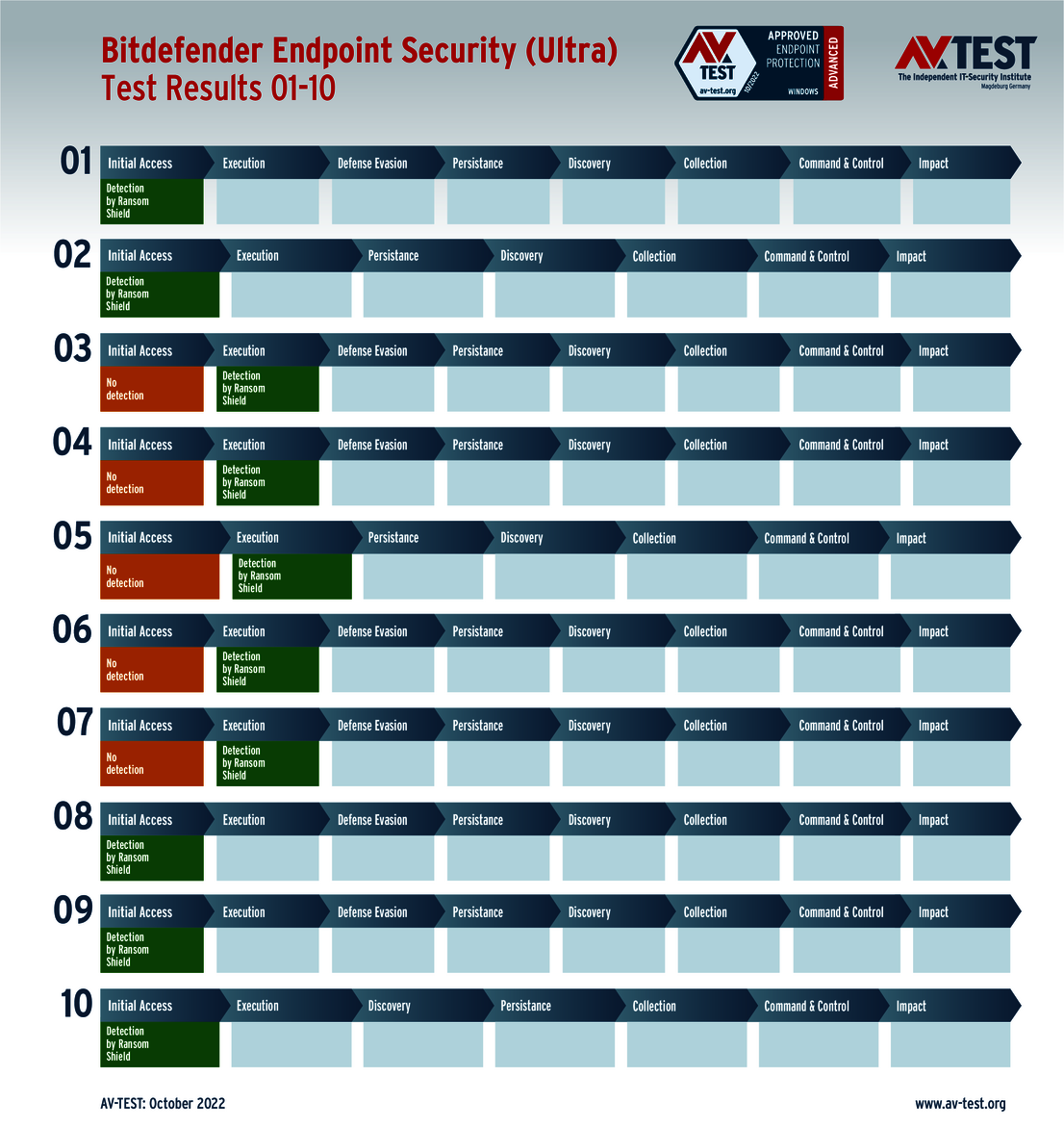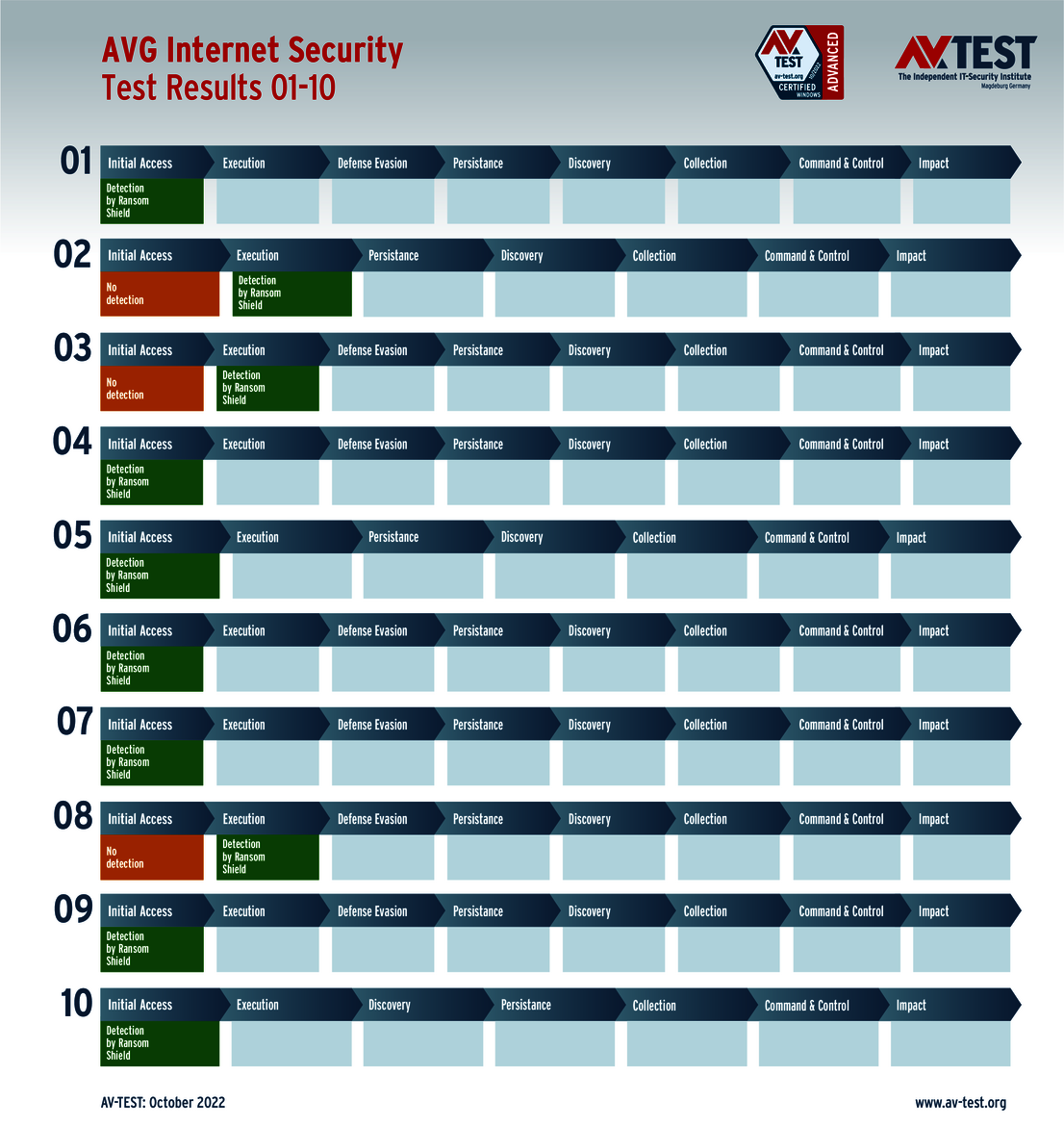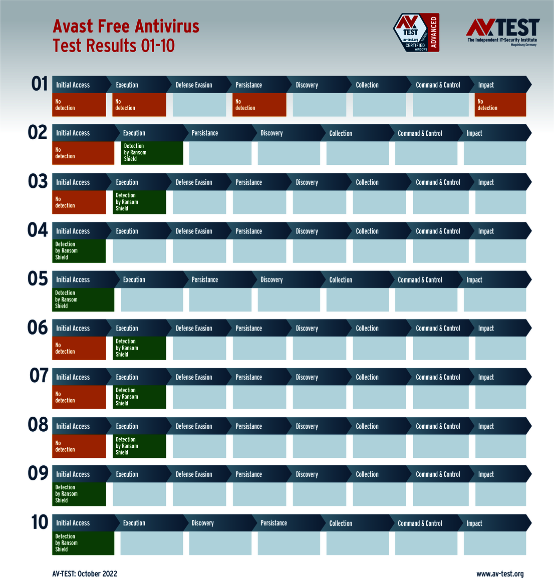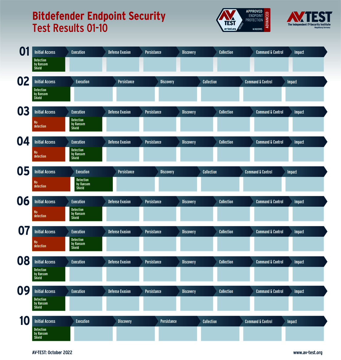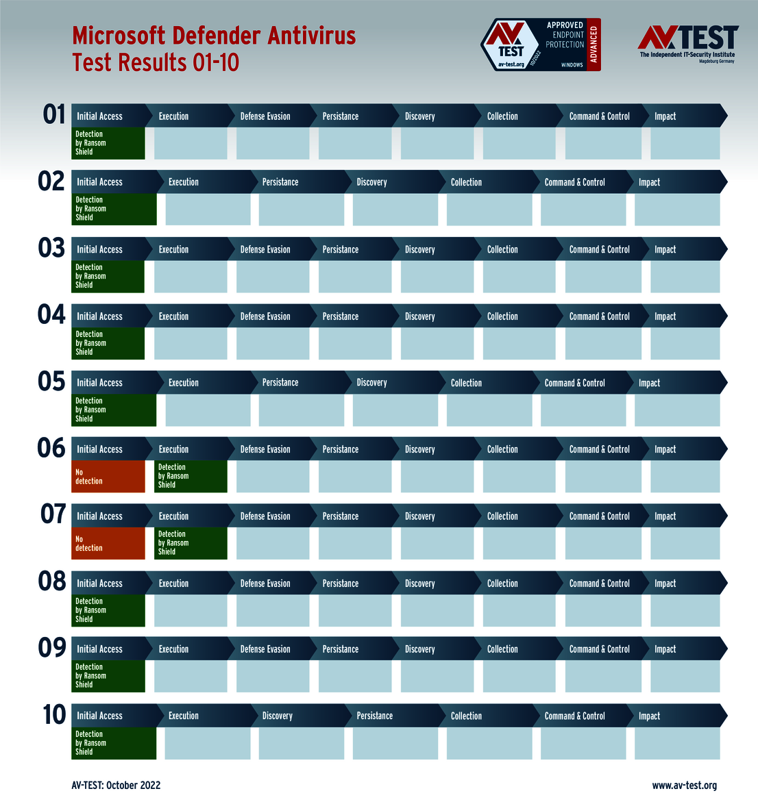 Avast with One Essential, AVG, Bitdefender, F-Secure, Kaspersky, Microsoft, Microworld and PC Matic detected all special attack techniques of the various 10 ransomware scenarios and received the maximum 30 points for the protection score.