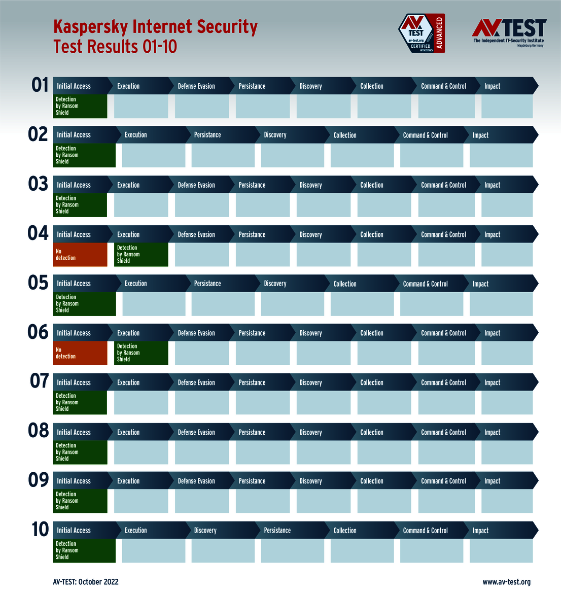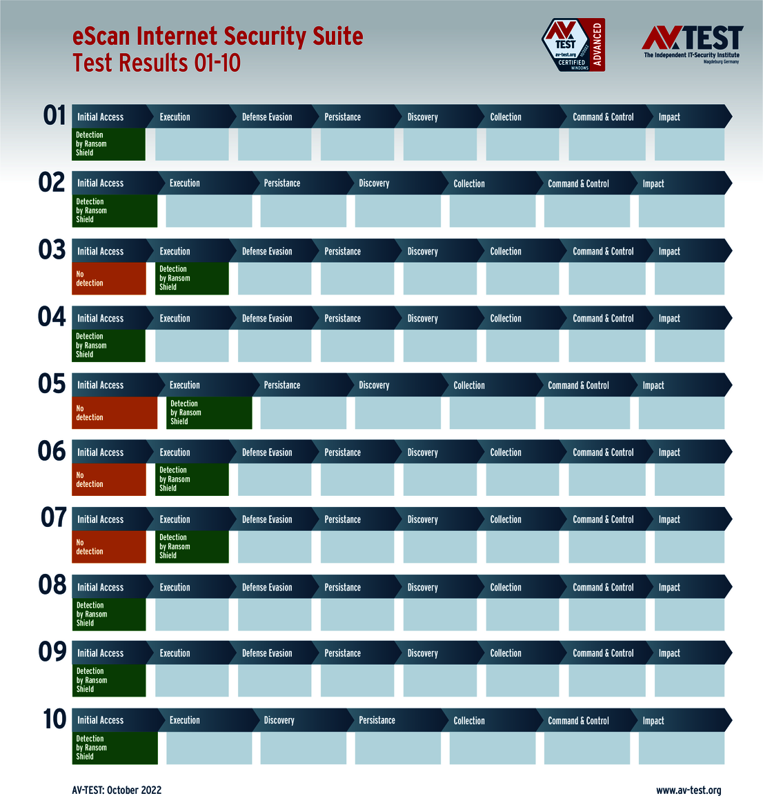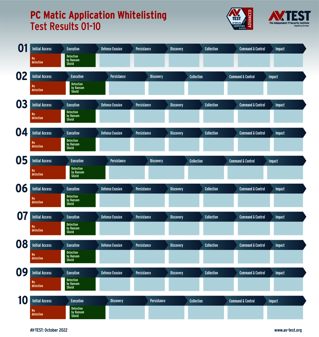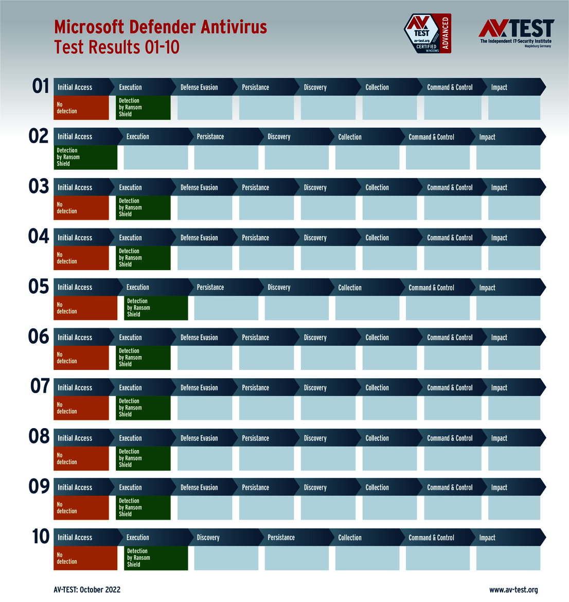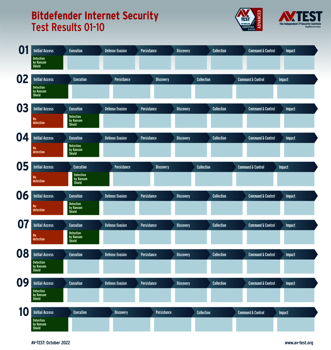 Avast with One Essential, AVG, Bitdefender, F-Secure, Kaspersky, Microsoft, Microworld and PC Matic detected all special attack techniques of the various 10 ransomware scenarios and received the maximum 30 points for the protection score.