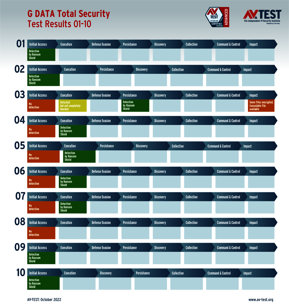 In order to find a more detailed explanation of the evaluation tables and the individual color codes in the traffic light system please see also the article ”Test and Study: Do Security Solutions stop Current Ransomware under Windows 11?“.
