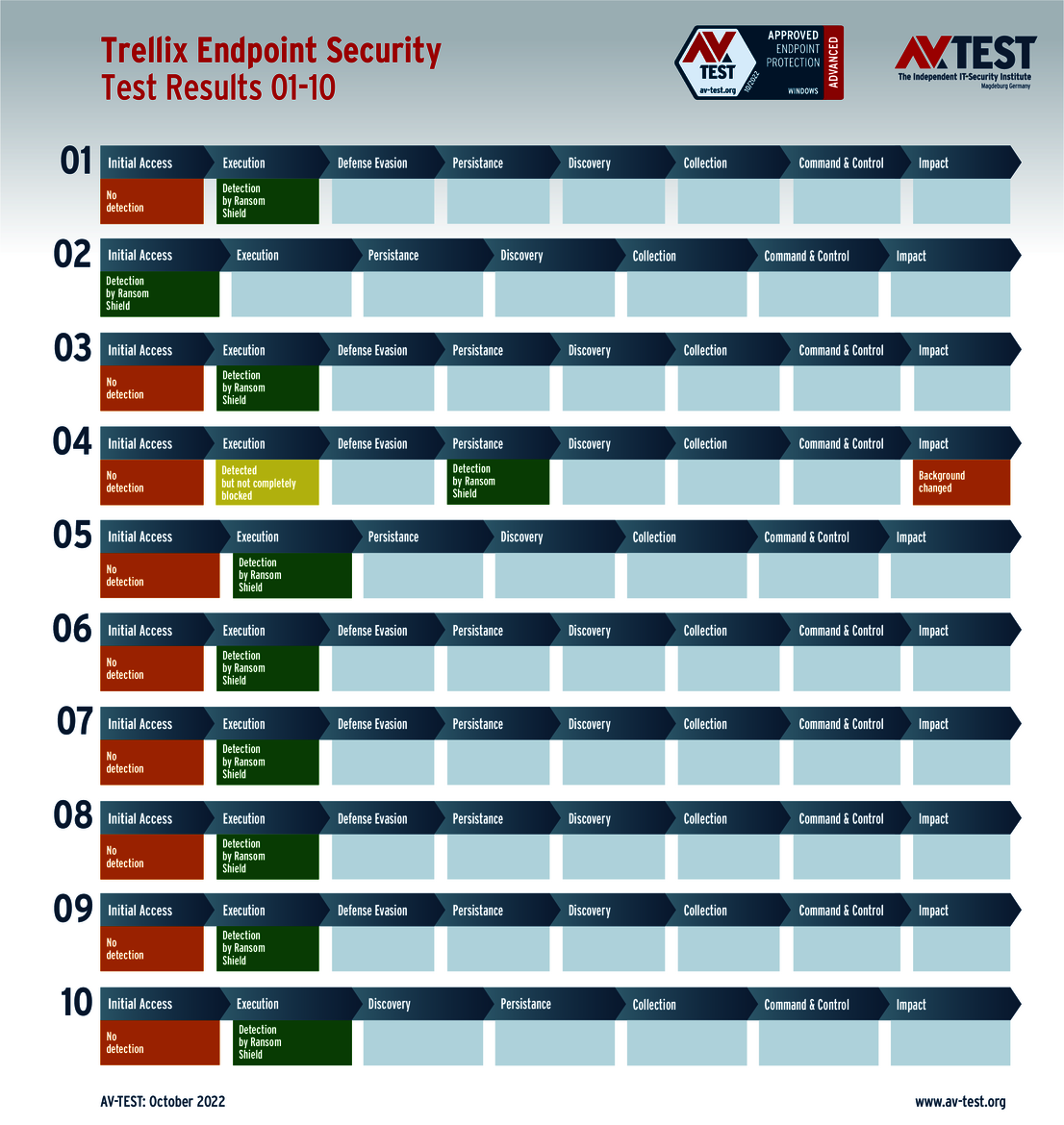 G DATA and Trellix did detect all attackers, but in one test run, each of the products failed to totally block the aggressor, and there was encryption of individual files. But each still achieved 29 points on its protection score.