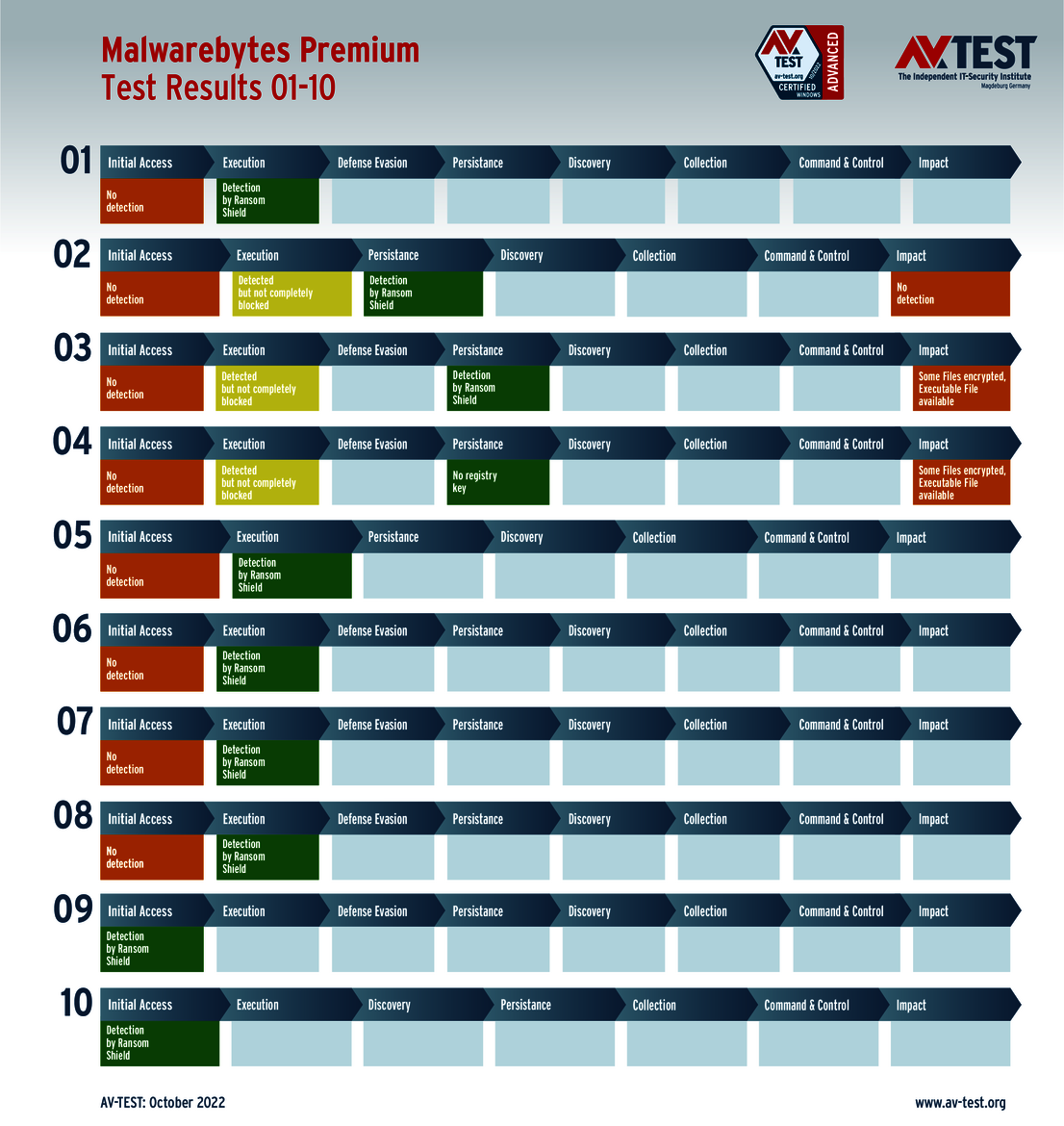 Malwarebytes Premium did manage to detect all 10 attackers, but was only able to partially block them. Thus, three malware samples were able to encrypt individual files: 27 points out of a possible 30.