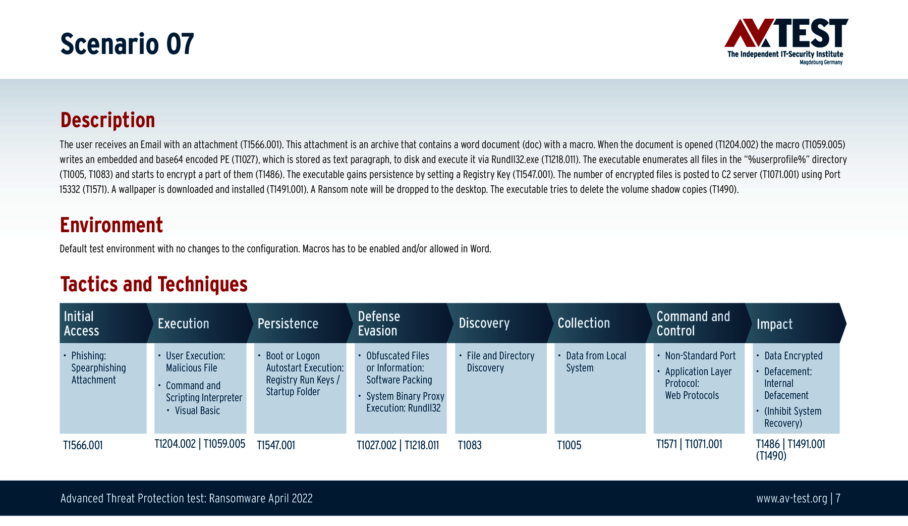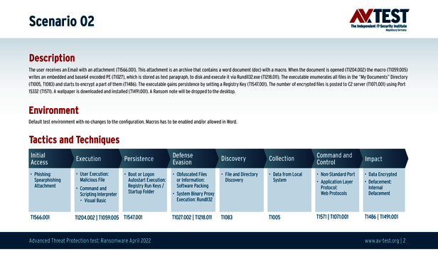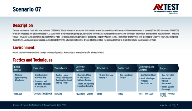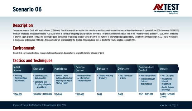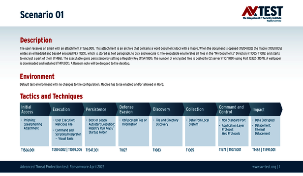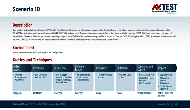 In 10 defined, realistic scenarios under Windows, each individual solution is required to detect and fend off ransomware or identify its further steps and stop the attack. The 10 scenarios are explained in the charts below. An e-mail arrives with a zip file attachment, for example. It contains an executable file that launches immediately upon unzipping. Afterwards, the ransomware starts to take over and encrypt the system with various steps. The test scenarios list the type of attack in each step. In the process, the lab specifies the definitions in MITRE ATT&CK “Techniques” codes. The lab also explains the exact technical steps of an Advanced Threat Protection test in the already released article New Lines of Defense: EPPs and EDRs Put to the Test Against APT and Ransomware Attacks.