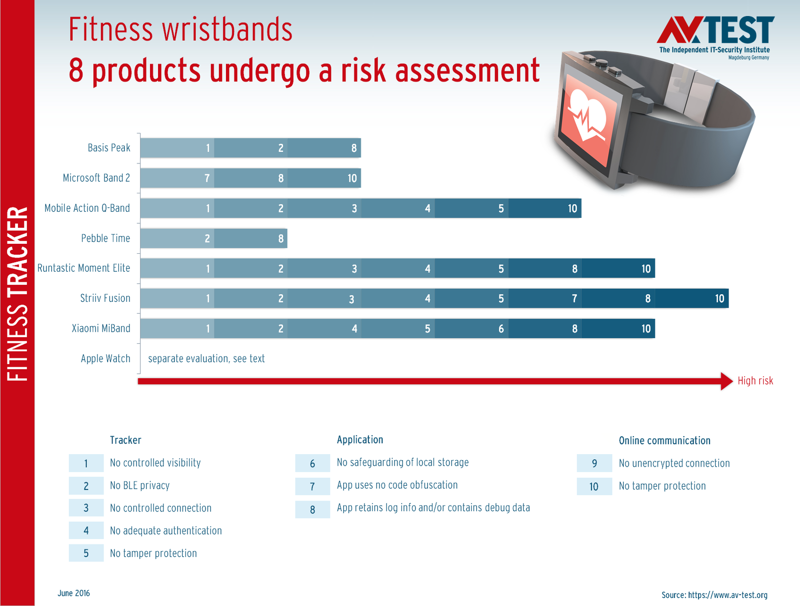 Fitness wristbands and smart watches are extremely popular, not only with sports fans. Health insurance companies are now even subsidizing the purchase of a tracker or rewarding their use, as fit people cost the insurance companies less. That is why the experts from AV-TEST examined 7 of the latest fitness wristbands under Android and the Apple Watch in terms of their security. The result: some manufacturers are continuing to make disappointing errors.