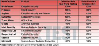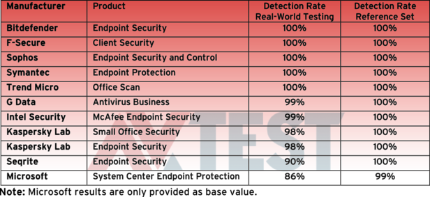 The laboratory at AV-TEST tested a total of 11 security solutions in the lab in terms of their protection, performance and usability. The first 10 products come from Bitdefender, F-Secure, G Data, Kaspersky Lab (2 versions), Intel Security (formerly McAfee), Seqrite, Sophos, Symantec and Trend Micro. The Microsoft solution System Center Endpoint Protection was evaluated as the 11th product. Its scores serve as benchmarks for the first 10 products. This is because the Microsoft solution cannot be purchased individually but is only available as a free module in the Microsoft Management Suite System Center 2012 bundle.