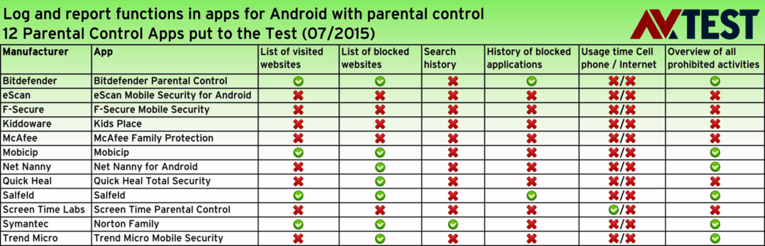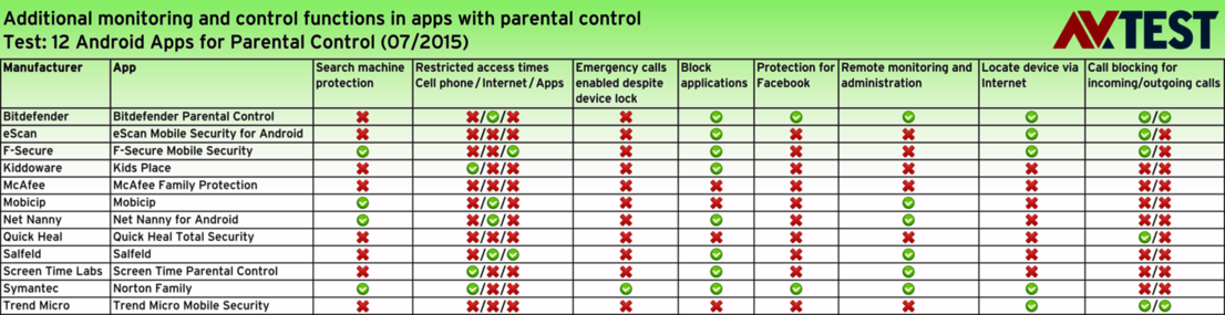 The majority of smartphones sold run on Android. That is why the market also offers a variety of parental control software. It is already embedded in many security apps as a parental control feature. But there are also separate apps dedicated solely to parental control. The AV-TEST lab examined the working features of 12 apps in total. 4 of them are security packages with parental control features for children, and 8 are strictly parental control apps. The apps are from Bitdefender, eScan, F-Secure, Kiddoware, McAfee, Mobicip, Net Nanny, Quick Heal, Salfeld, Screen Time Labs, Symantec and Trend Micro.