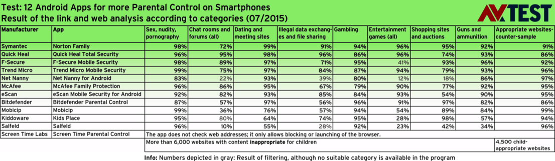 The test examines the technology or evaluation logic of the apps. To do so, each app was required to weed out over 6,000 websites that are definitely not appropriate for children. As a counter-test, 4,500 websites suitable for children were called up in an additional test segment. The difficulty of this task lies in the following: a fairy-tale website is definitely for children. The website of a car dealership may not be a children's site, but it is indeed suitable for children and therefore should not be blocked. It was necessary to accurately analyze the logic of the apps and to ensure that not too many websites were blocked in error. Because, if this occurs too often, children will become annoyed and will be determined to circumvent the parental control or eliminate it completely. In the findings, it was apparent that the apps highly effective in blocking certain categories, such as Symantec, Quick Heal or F-Secure, also blocked too many websites suitable for children in the counter-test. The best apps in the counter-test, such as Mobicip, Kiddoware or Salfeld are in turn somewhat weaker in filtering categories.