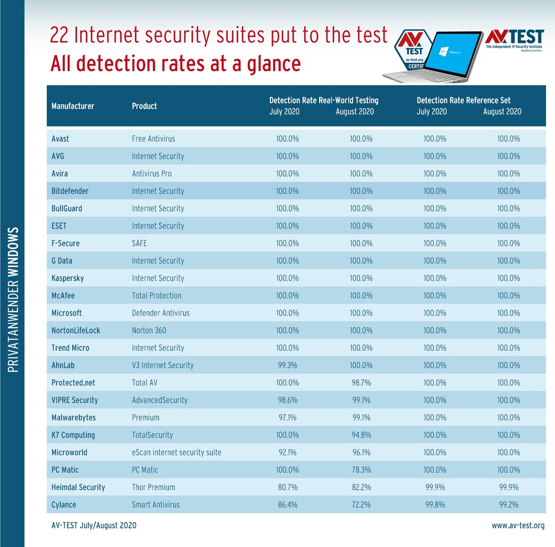 The table with the listing of detection values shows which products completed the test segments with 100% detection. They come from Avast, AVG, Avira, Bitdefender, BullGuard, ESET, F-Secure, G Data, Kaspersky, McAfee, Microsoft, NortonLifeLock, and Trend Micro. The packages from AhnLab and Protected.net each only exhibited minor false detection in one of the four test segments.