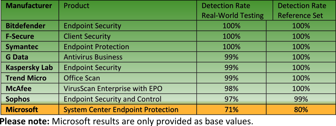 The System Center Endpoint Protection from Microsoft, also tested for comparison, is not an advisable alternative. Its performance in detecting malware was too low at 71 and 80 percent respectively. The top finishers achieved between 99 and 100 percent in this category.