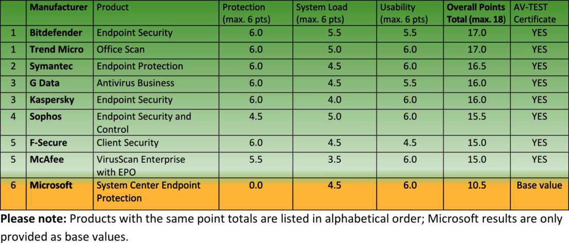 No product was able to achieve a perfect score. But at 17 points each, the solutions from Bitdefender and Trend Micro came awfully close to maximum. Symantec reached 16.5 points, followed by the rest of the products with 15 to 16 points. The basic protection from Microsoft, included in the test, only managed to score 10.5 points.