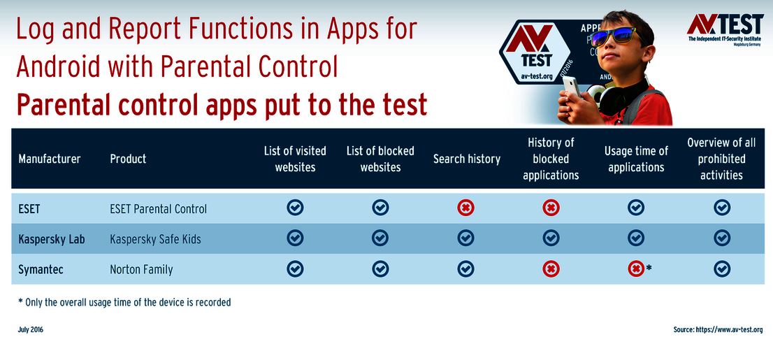 The products ESET Parental Control, Kaspersky Safe Kids and Symantec Norton Family pass all the test criteria and thus receive from AV-TEST the certificate "APPROVED Parental Control Android 07/2016".