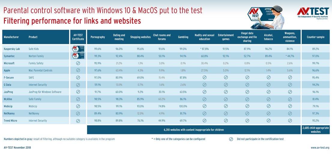 It is natural for parents to secure their children with a seat belt in a car. It ought to be just as natural for them to protect their kids via parental control software when using the Internet and social media. AV-TEST evaluated which parental control products are effective as a digital safety belt under Windows 10 and MacOS for the Internet.