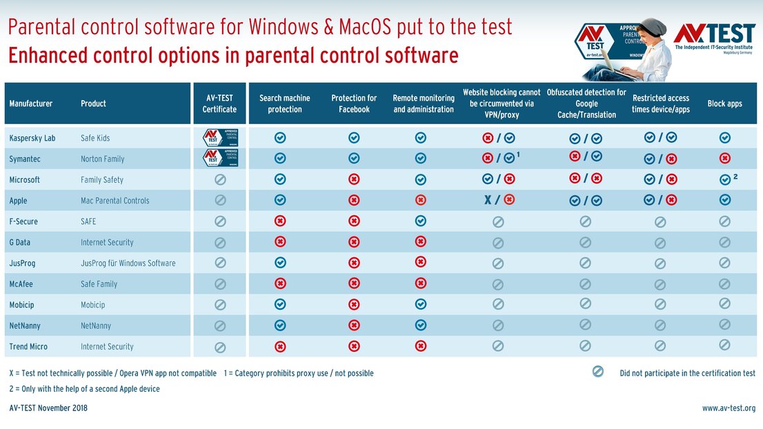The products Kaspersky Lab Safe Kids and Symantec Norton Family underwent an advanced certification test and also passed with flying colors. Both receive the certificate APPROVED Parental Control Windows 11/2018. The system tools from Windows and Mac were also evaluated in a direct comparison. The other 7 products were only tested in terms of partial functions.