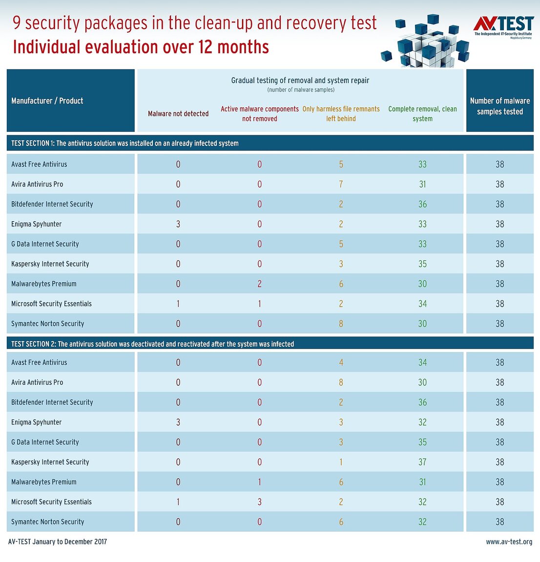 The two best security packages come from Bitdefender and Kaspersky with 72 out of 76 completely repaired and cleaned-up systems each. In each of the 4 cases, the tools left behind harmless file remnants.