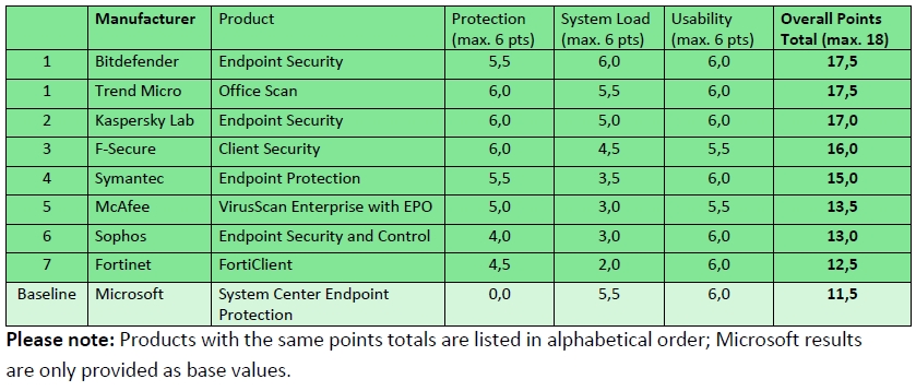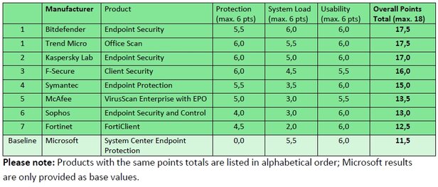 The results of the test reveal a clear outcome, with not one, but two solutions scoring 17.5 of a maximum possible of 18 points in the overall result, while the basic protection provided by Microsoft was unable to achieve any better than a total of 11.5 points.