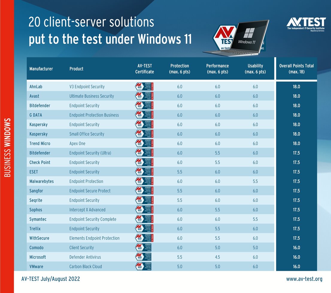 With their new corporate solutions, security software manufacturers are providing the right Windows 11 client. According to Microsoft, Windows 11 has received a total facelift in terms of security. It is said to be more secure and faster, and now features its own security center. But is Microsoft delivering on its promise? The lab at AV-TEST examined 20 client-server solutions for companies under Windows 11. Also in the mix: Windows Defender with all its protection functions, made out to be the arbiter of all things.