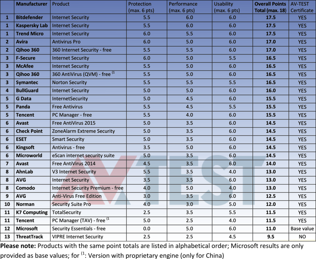 The experts at AV-TEST examined 17 purchased software and 11 freeware solutions, and compared them with one another. The best overall performers are the 3 commercial solutions from Bitdefender, Kaspersky and Trend Micro with 17.5 of 18 possible points.