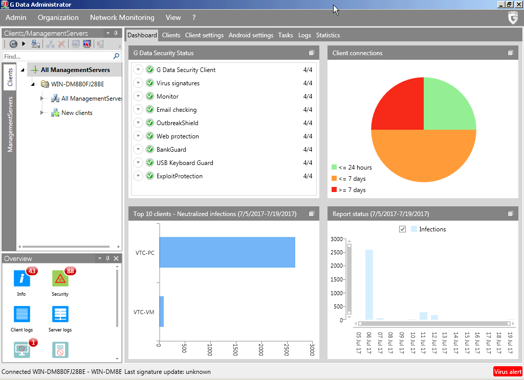 Durante los meses de julio y agosto de 2017, en AV-TEST hemos examinado la configuración establecida por los proveedores de 14 productos de seguridad destinados a las empresas (Endpoint Protection). En las pruebas siempre hemos utilizado las versiones más actuales de los productos de acceso al público las cuales se pudieron actualizar en cualquier momento y también utilizar sus servicios "en la nube”. Solo hemos tenido en cuenta escenarios de pruebas realistas y hemos comprobado los productos contra las amenazas actuales. Los productos han tenido que demostrar sus capacidades aplicando todas sus funciones y niveles de protección.