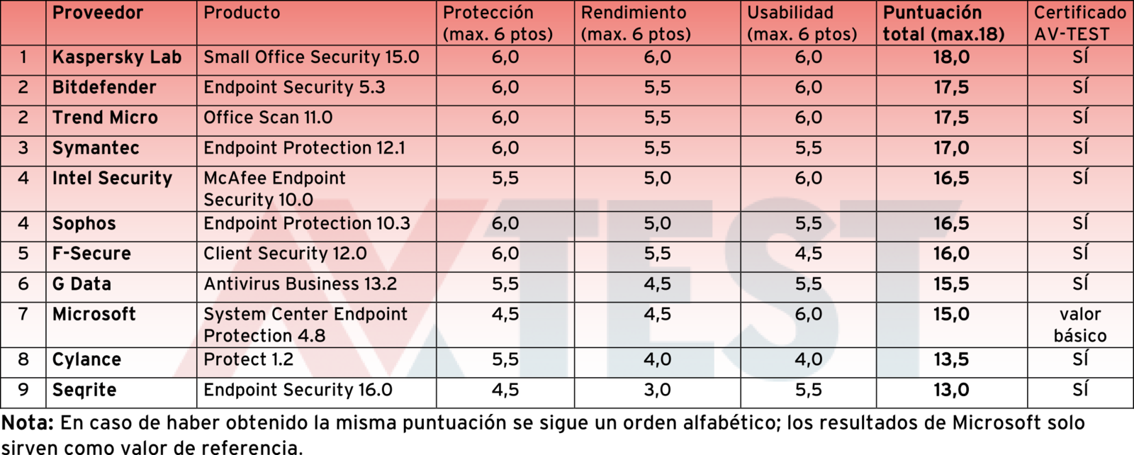 ¿Qué solución de seguridad para empresas ofrece ahora el mejor dúo cliente-servidor? AV-TEST ha comprobado la protección, el rendimiento y la usabilidad que ofrecen 11 productos. En las tres categorías se otorgaban como máximo 6 puntos respectivamente; por tanto, la puntuación máxima posible era 18 puntos. Solo la solución Small Office Security de Kaspersky Lab obtuvo dicha puntuación. A escasa distancia, con 17 y 17,5 puntos, la siguieron los productos cliente-servidor de Bitdefender, Trend Micro y Symantec.