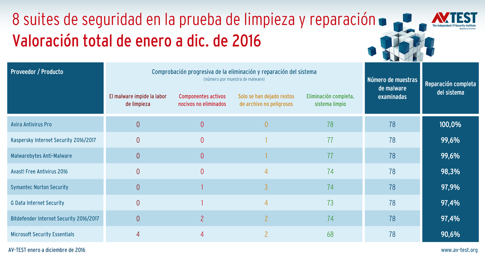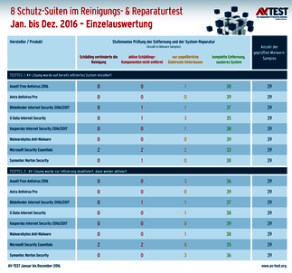 El resultado tras 12 meses de pruebas le parecerá a algunas víctimas como una luz al fondo del túnel: El mejor software de seguridad es Avira Antivirus Pro, que incluso instalándolo a posteriori pudo ayudar al 100 por cien en todos los 78 casos de pruebas en condiciones reales. La mejor herramienta especial tras una infección viral, como se comprobó en 39 pruebas en condiciones reales, es Kaspersky Virus Removal Tool. Ambos productos han sido por ello galardonados con el AV-TEST AWARD BEST REPAIR 2016.