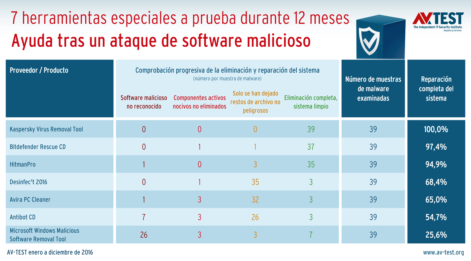 Todas las demás herramientas no detectaron al menos un software malicioso o no pudieron eliminar todos sus componentes activos. La herramienta Microsoft Windows Malicious Software Removal Tool quedó completamente fuera de juego con 27 malwares no detectados en 42 casos de prueba.