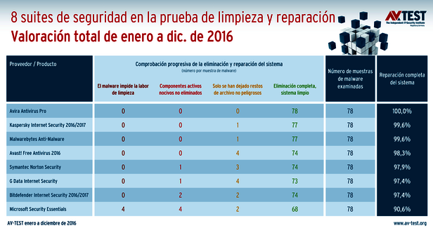 Avira Antivirus Pro, Kaspersky Internet Security 2016/2017, Malwarebytes Anti-Malware y Avast! Free Antivirus 2016 no dejaron que los detuviera ningún malware en ninguna de las pruebas. Además, siempre fueron capaces de eliminar los componentes activos peligrosos. Esto ya es todo un logro. Avira Antivirus Pro culminó el resultado eliminando asimismo todos los restos de archivo o entradas de registro no peligrosos. Esto lo convierte en el paquete con el mejor rendimiento total en la prueba de larga duración.