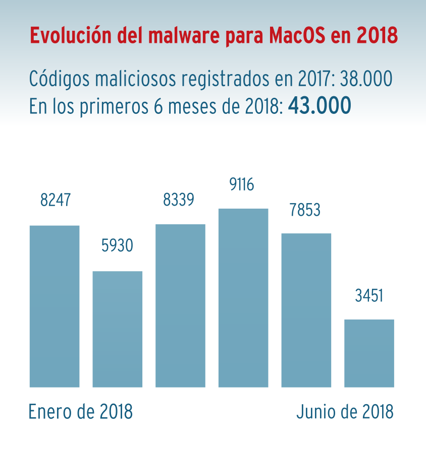El mundo Mac está cada vez más en el punto de mira de los codificadores de malware. En junio de 2018, la cifra de nuevo código malicioso para MacOS ascendía ya a 37.000 ejemplares y, por tanto, casi alcanzaba ya la cantidad de todo el año 2017 que fue de 43.000 ejemplares. Estos siguen siendo muchos menos casos que en el mundo Windows, pero esta cifra es 100 veces superior o más a la que vaticinaban los expertos en Mac hace unos años.