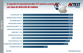 4 de los 12 paquetes ofrecieron la máxima prestación del 100 por cien en la detección de malware: AVG, Bitdefender, ESET y Microworld. Otros 4 paquetes cometieron pequeños fallos y reconocieron el 99,17 por ciento: Avast, Kaspersky, Sophos y Symantec. La cosa decrece en el caso de los productos de Dr. Web, Avira, Canimaan Software y ProtectWorks. Estos detectan solo entre el 49 y el 98,33 por ciento del software maligno. El laboratorio utilizó 120 malwares para Mac seleccionados, que había recopilado un par de meses antes de la prueba.