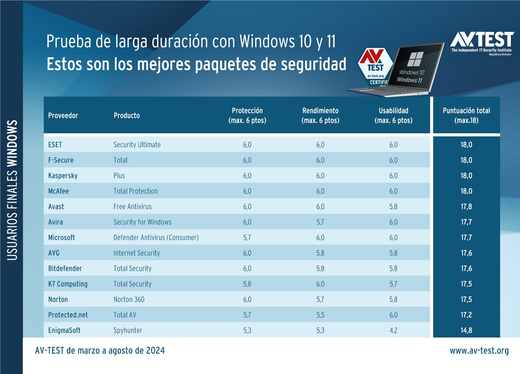 En la prueba de larga duración con Windows 10 y 11 participaron los productos de los siguientes fabricantes: Avast, AVG, Avira, Bitdefender, EnigmaSoft, ESET, F-Secure, K7 Computing, Kaspersky, McAfee, Microsoft, Norton y Protected.net. Todos los productos fueron examinados en las categorías de protección, rendimiento y usabilidad. En cada sección de la prueba, el laboratorio otorga hasta 6 puntos. La máxima puntuación obtenible es, por tanto, 18 puntos. Los productos tuvieron mucho que hacer y los examinadores registraron muchísimas puntuaciones de prueba para el resultado final. Y este es muy interesante: de los 13 paquetes de protección examinados en la prueba de larga duración, 12 alcanzaron entre 17,2 e incluso 18 puntos. No obstante, solo 4 productos obtuvieron la máxima puntuación. Estos proceden de ESET, F-Secure, Kaspersky y McAfee. Solo un producto ocupa el último lugar de la tabla con un resultado inferior.